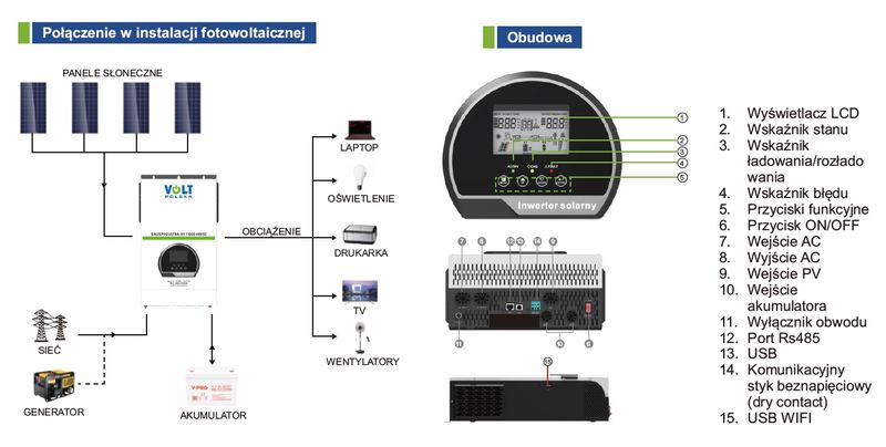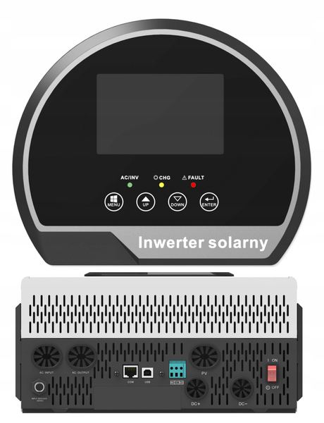 Total power (instantaneous): 11000VA Constant Power: 5200W Battery voltage: 48VDC Transfer time : 10ms(UPS)/20ms(APL) Input voltage range (photovoltaic panel): Vmp: 150~430VDC Voc:450VDC Max charging current: 100A MPPT Input voltage range (mains power):170VAC-280VAC Mains charging current: 80A Output voltage range (converter):230V+-3% Working temperature:0-50°C Dimensions: 295x505x14,2mm Weight: 13kg