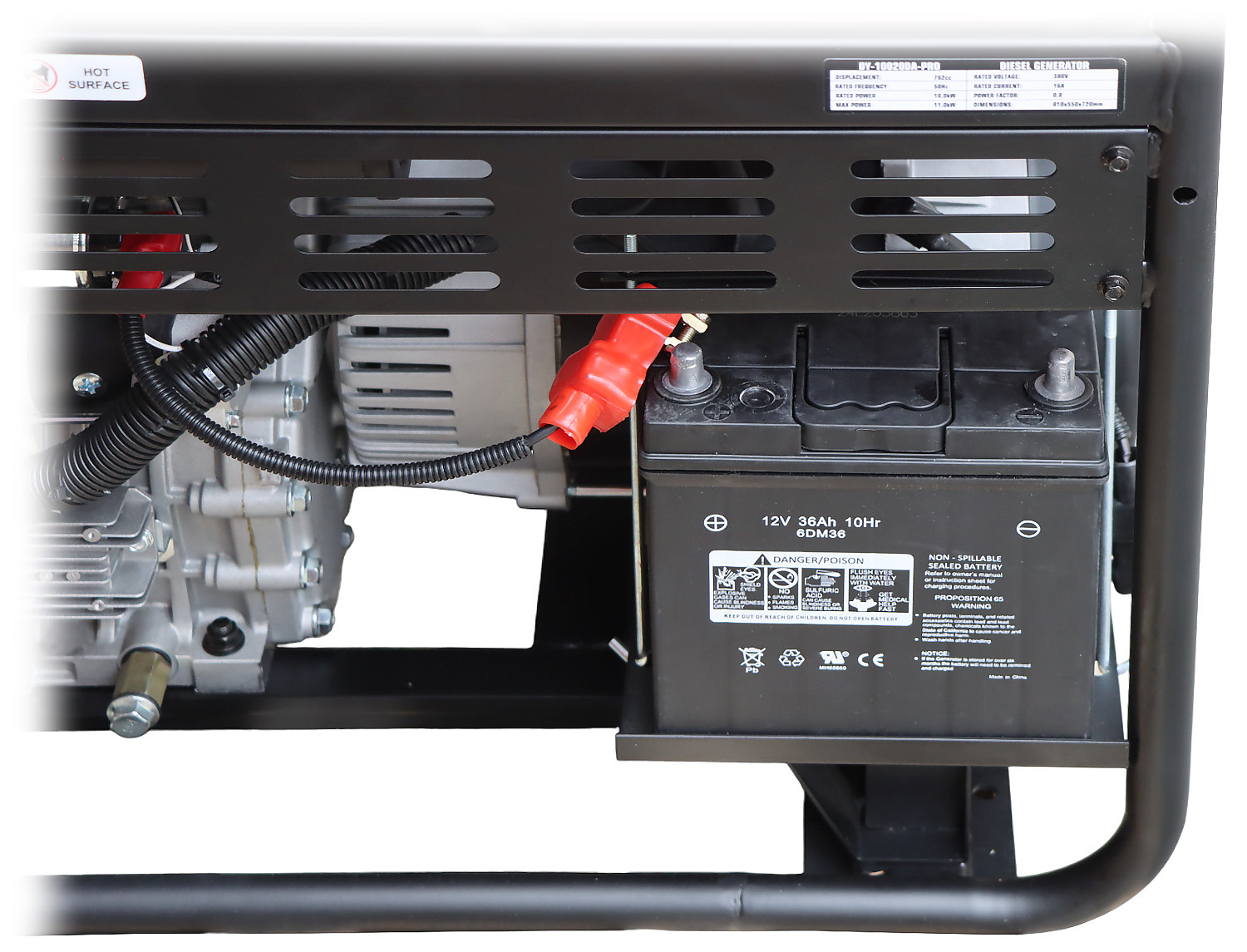 Nominal power: 10 kW, 3 kW - for a single-phase socket ; Output voltage: 230 V AC, 400 V AC ; Number of outlets: 1 pcs - three-phase, 32 A IEC 60309, 2 pcs - single-phase, 16 A CEE 7/4 (Schuko) ; ATS compatible; Built-in voltmeter; Voltage stabilization: AVR ; Frequency measurement in Hz; Measuring the number of engine hours; 12V DC output; Engine type: diesel engine with direct fuel injection, 1 cylinder ; Starting the engine: Electric - starter motor ; Noise level during operation: 95 dB ; Fuel gauge;
