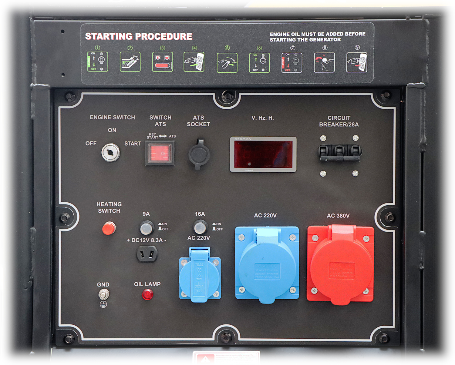 Nominal power: 18 kW, 6 kW - for a single-phase socket ; Output voltage: 230 V AC, 400 V AC ; Number of outlets: 1 pcs - single-phase, 16 A IEC 60309, 1 pcs - single-phase, 16 A CEE 7/4 (Schuko), 1 pcs - three-phase, 32 A IEC 60309 ; ATS compatible; Voltage stabilization: AVR ; Built-in voltmeter; Frequency measurement in Hz; Measuring the number of engine hours; 12V DC output; Starting the engine: Electric - starter motor ; Noise level during operation: 95 dB ; Fuel gauge;