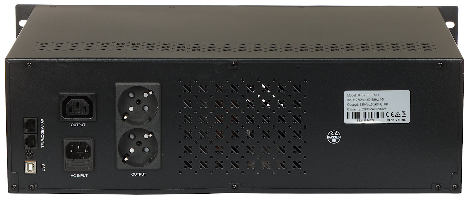 Nominal power: 1200 W ; Apparent Power: 2000 VA ; Battery: 2 pcs ; Estimated battery operation time: 62 minutes @ 100 W, 31 minutes @ 200 W, 16 minutes @ 300 W, 9.5 minutes @ 500 W, 2.5 minutes @ 800 W, 1 minute @ 1000 W ; Number of outputs: 3 pcs ; Operation state indication: LCD display: in/out voltage level, in frequency, battery capacity, load, alarm, Sound signaling ;