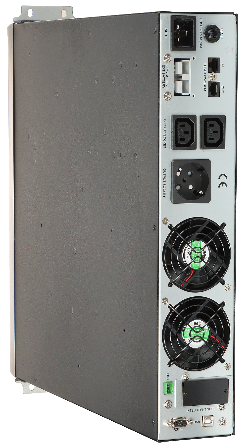 Nominal power: 2700 W ; Apparent Power: 3000 VA ; Estimated battery operation time: 120 minutes @ 200 W, 60 minutes @ 400 W, 40 minutes @ 600 W, 25 minutes @ 800 W, 20 minutes @ 1000 W, 12.5 minutes @ 1200 W, 9 minutes @ 1600 W, 7.5 minutes @ 1800 W, 6.5 minutes @ 2000 W, 5 minutes @ 2400 W, 4 minutes @ 2700 W ; Number of outputs: 1 pcs (Schuko), 2 pcs IEC-320 C13 ; Operation state indication: LCD display: operation mode, battery charging level, in/out voltage level, overload indicator, Sound signaling ;