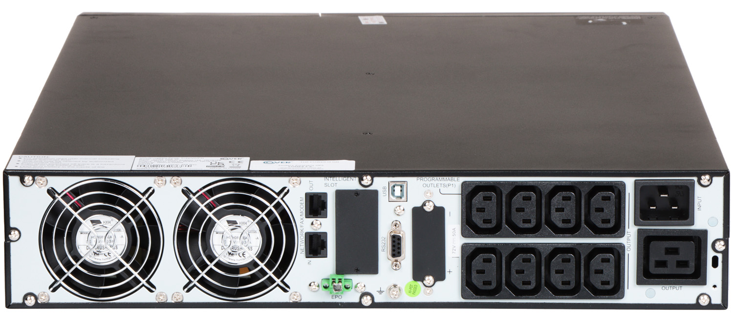 Output voltage shape: Pure Sine Wave ; Nominal power: 3000 W ; Apparent Power: 3000 VA ; Estimated battery operation time: 11 minutes @ 1500 W, 6 minutes @ 2250 W, 4 minutes @ 3000 W ; Number of outputs: 8 pcs IEC-320 C13 ; Operation state indication: LCD display: operation mode, battery charging level, in/out voltage level, overload indicator, Sound signaling ; Main features: Auto restart while AC is recovering ;