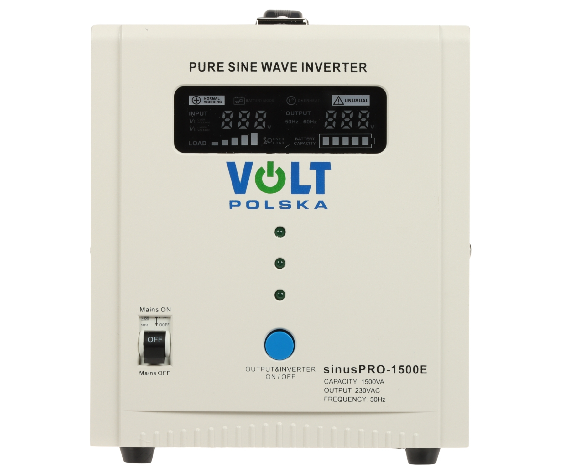 Output voltage shape: Pure Sine Wave ; Nominal power: 1000 W ; Apparent Power: 1500 VA ; Number of outputs: 2 pcs ; Operation state indication: LED display ;