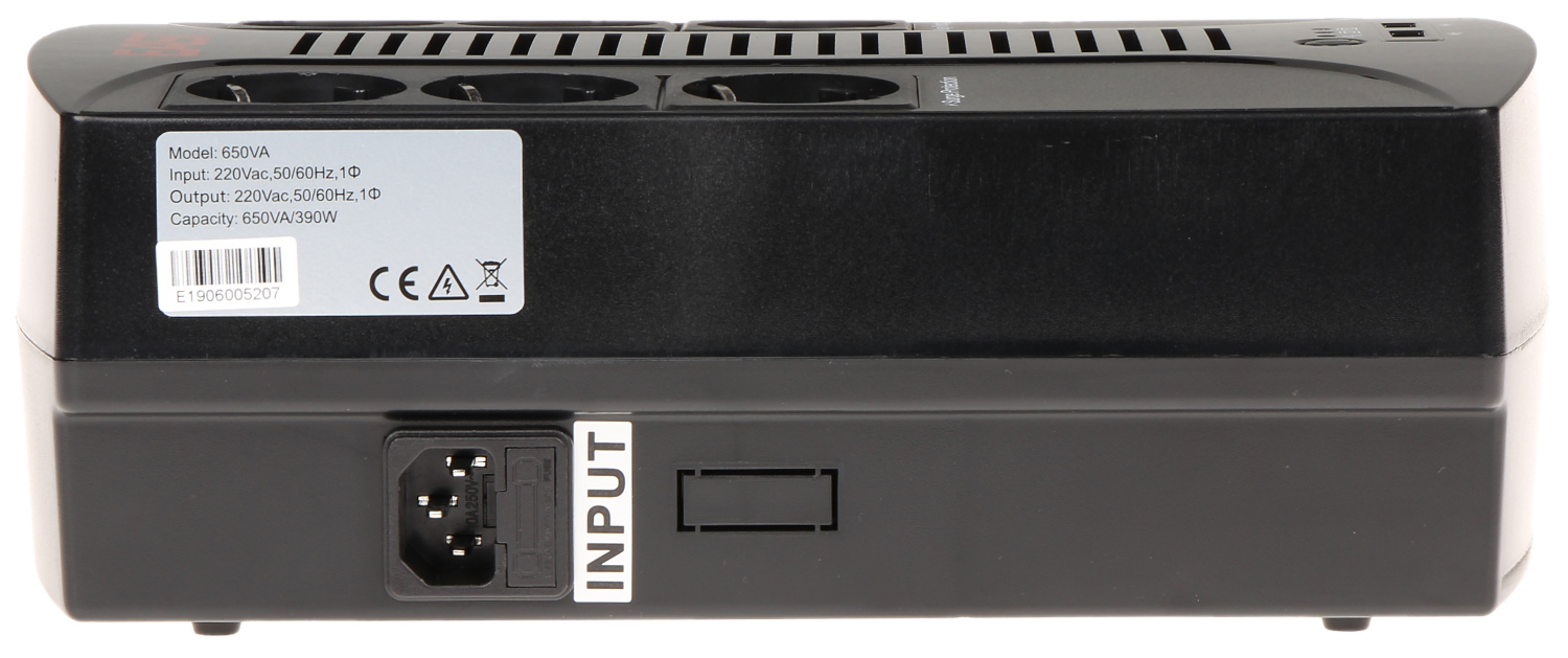 Nominal power: 390 W ; Apparent Power: 650 VA ; Battery: 1 pcs ; Estimated battery operation time: 17 minutes @ 100 W, 6 minutes @ 200 W 2 minutes @ 300 W ; Number of outputs: 6 pcs ; Operation state indication: LED diodes, Sound signaling ;