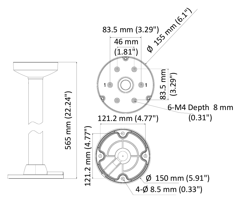 Mounting holes distance: 83.5 mm, 46 x 83.5 mm ; Number of holes: 2 or 4 ; Bearing capacity: 3 kg ; Neck diameter: Ø 155 mm ; Suitable for cameras: Hikvision ; Material: Aluminum alloy ; Color: White ; Distance from mounting surface: 565 mm ;