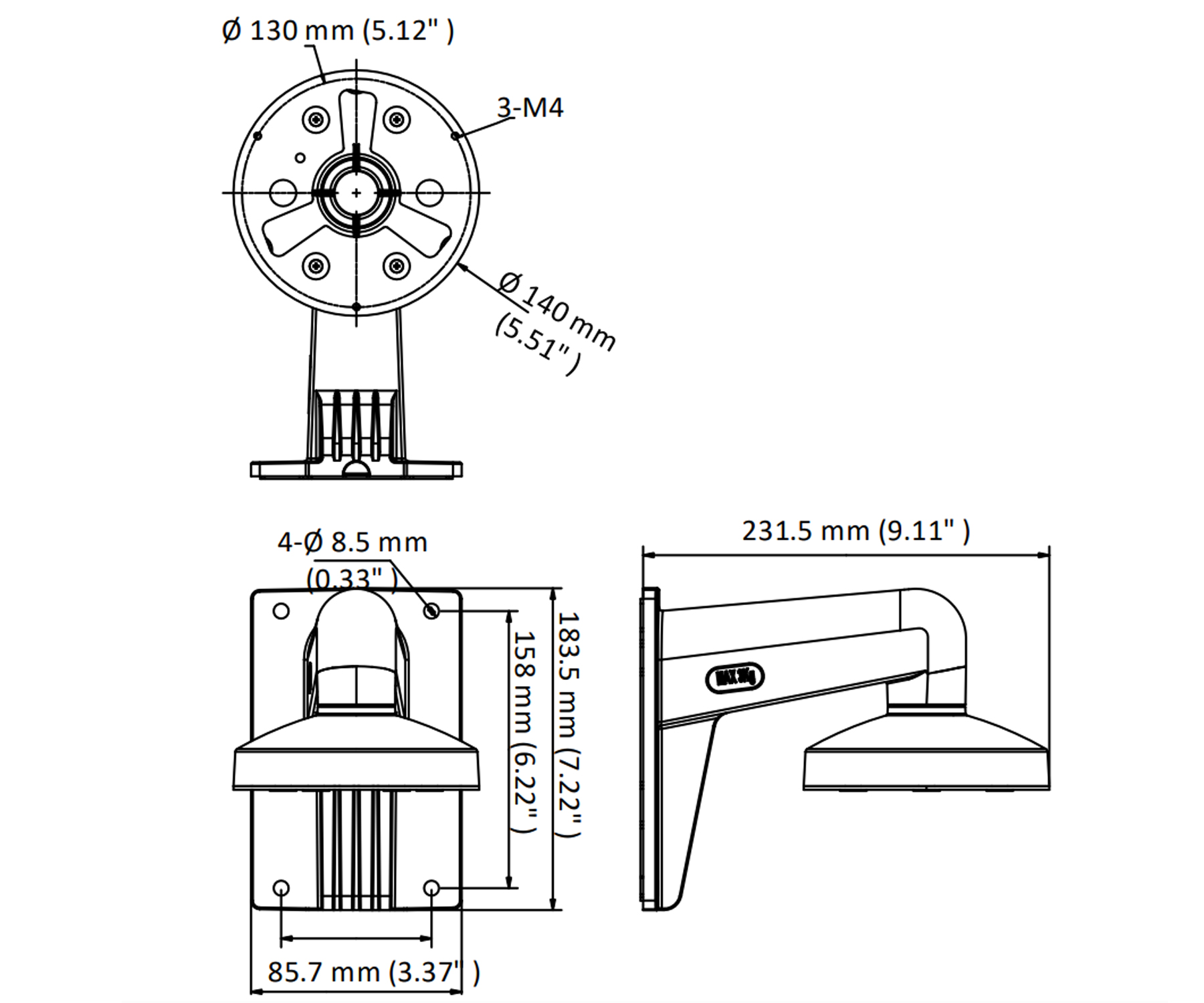 Neck diameter: Ø 140 mm ; Suitable for cameras: Hikvision ; Material: Aluminum ; Color: White ; Distance from mounting surface: 92 mm ;