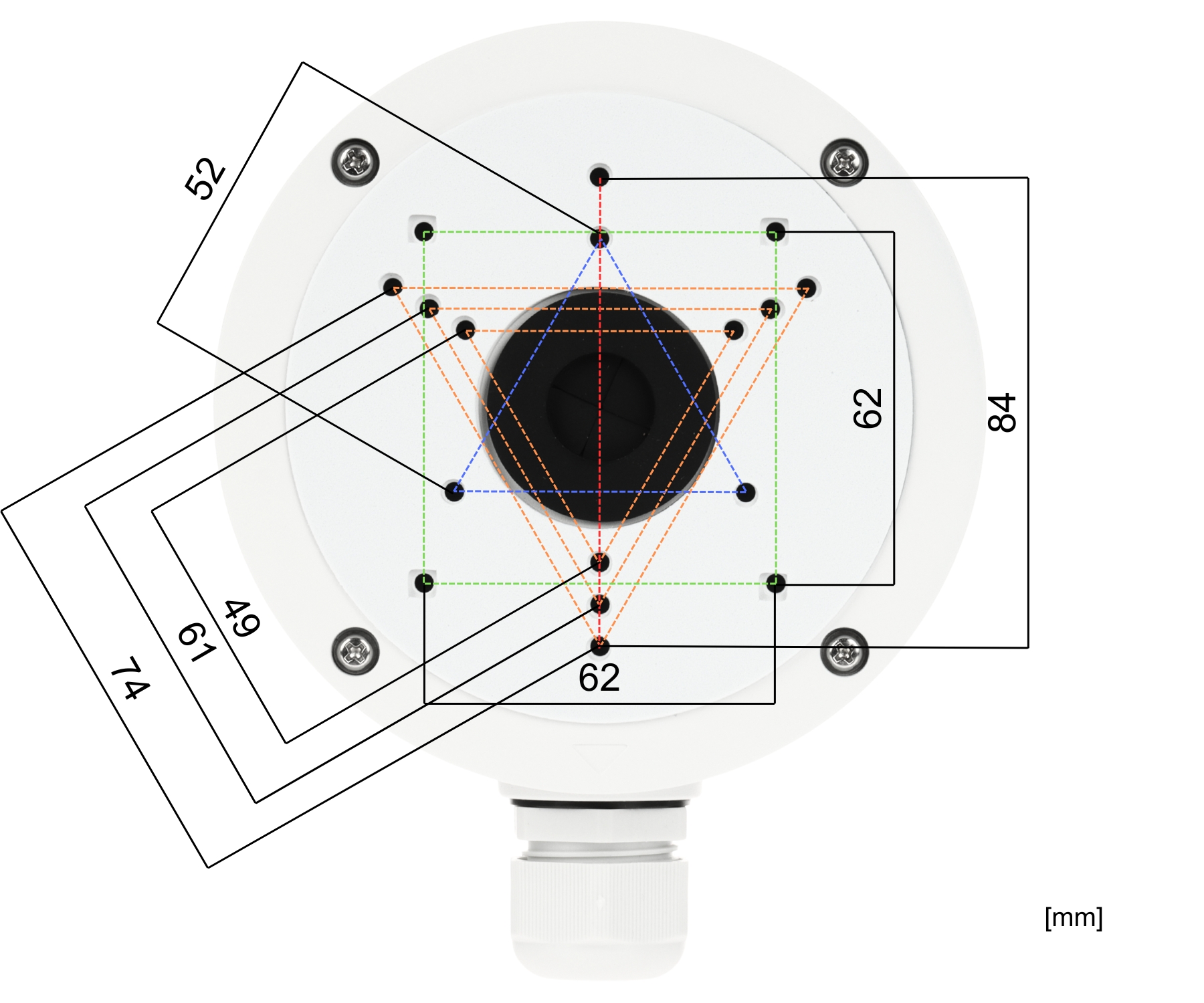 Neck diameter: Ø 138 mm ; Suitable for cameras: Hikvision ; Material: Aluminum ; Color: White ; Distance from mounting surface: 54 mm ;