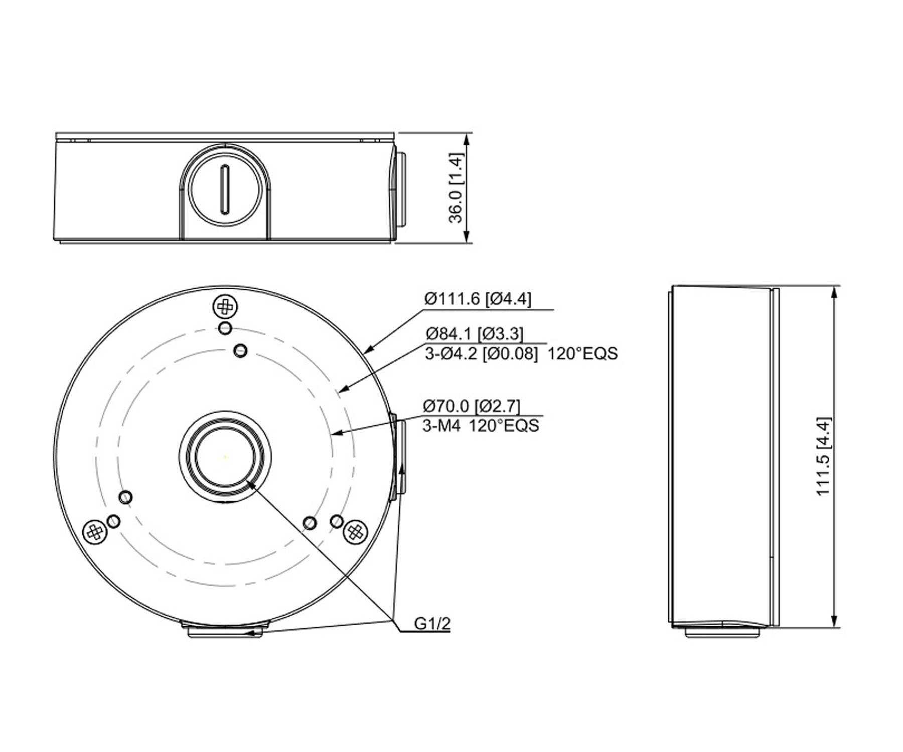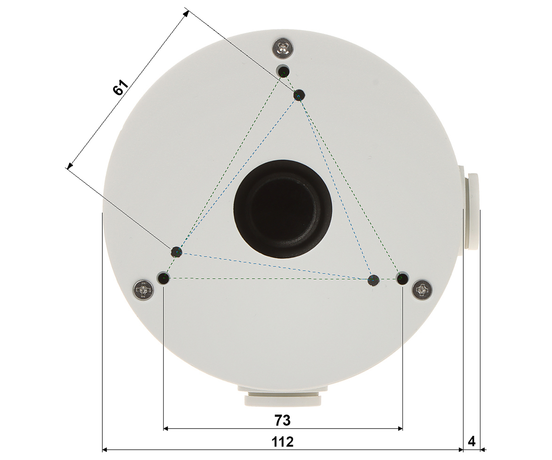 Mounting holes distance: 61 mm, 73 mm ; Number of holes: 2 x 3 ; Neck diameter: Ø 112 mm ; Material: Aluminum alloy ; Color: White ; Distance from mounting surface: 36 mm ;