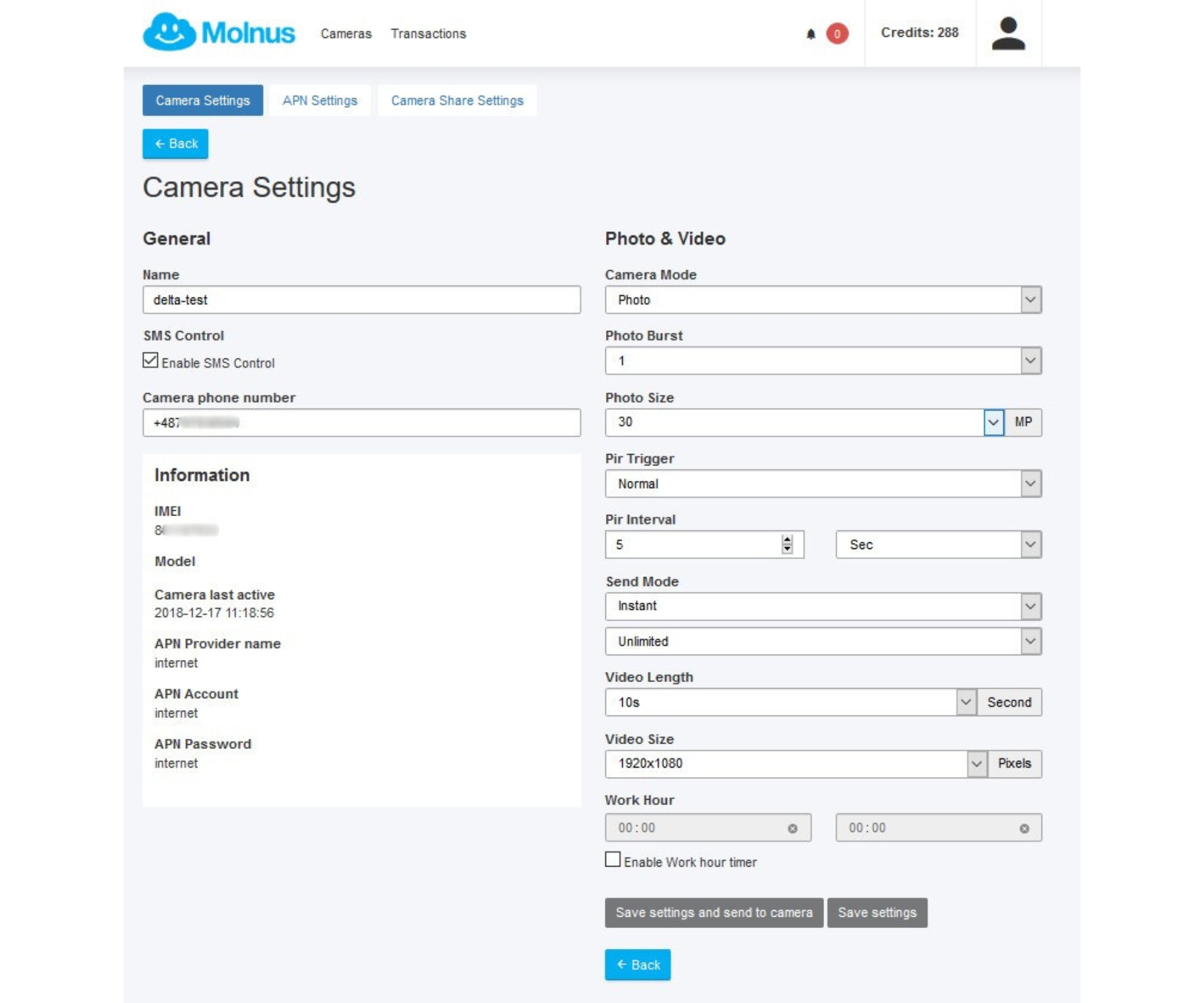 View angle: 45 ° ; IR illuminator wavelength: 940 nm (invisible to the human eye) ; Range of IR illumination: 30 m ; White light LED illuminator range: 30 m ; External memory: max. 64 GB SD memory card ; Audio: Microphone built-in ; GSM/GPRS communication: LTE / 4G support, sending the MMS or e-mail messages with images to the previously set mobile phone numbers or e-mail addresses, Auto-uploads captured pictures to FTP or the client, Molnus application ; Main features: The device supports the Molnus cloud, which is also possible to access from the smartphone using the application ;