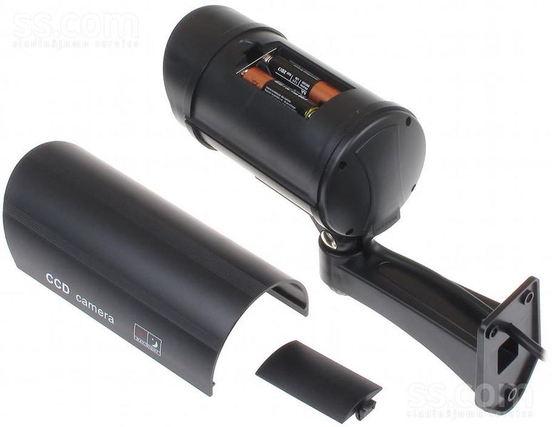 Муляж уличной камеры видео наблюдения. - имитация объектива и подсветки ИК - настенный кронштейн - мигающий красный диод - питание от батареек АА - размер без кронштейна 170х80х80 мм