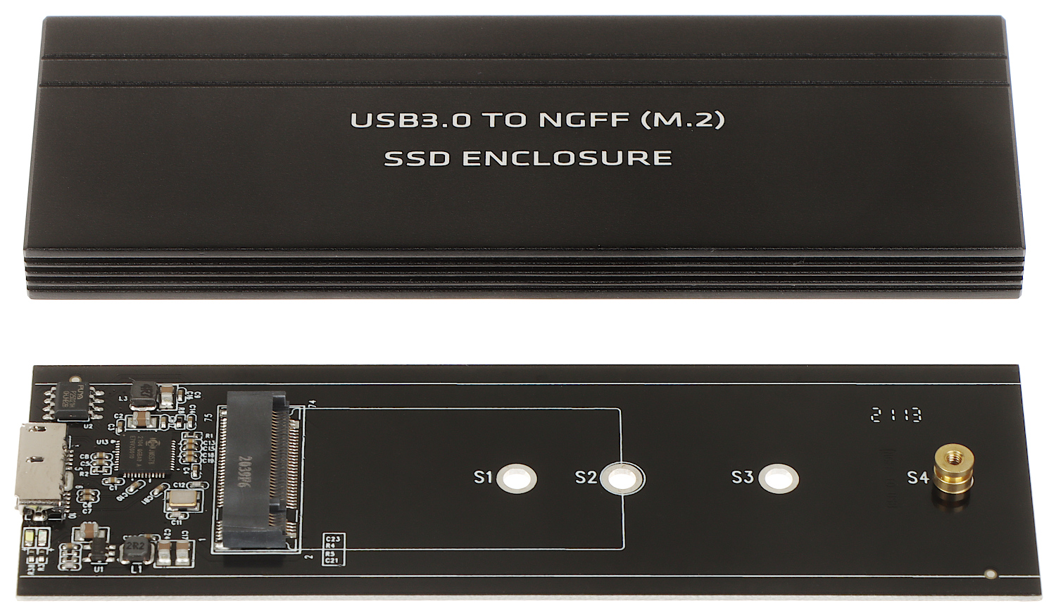 Supported hard drives: 1 x M.2 SATA III : 2230 / 2240 / 2260 / 2280 ; Outputs: 1 x USB 3.0 Micro B ;