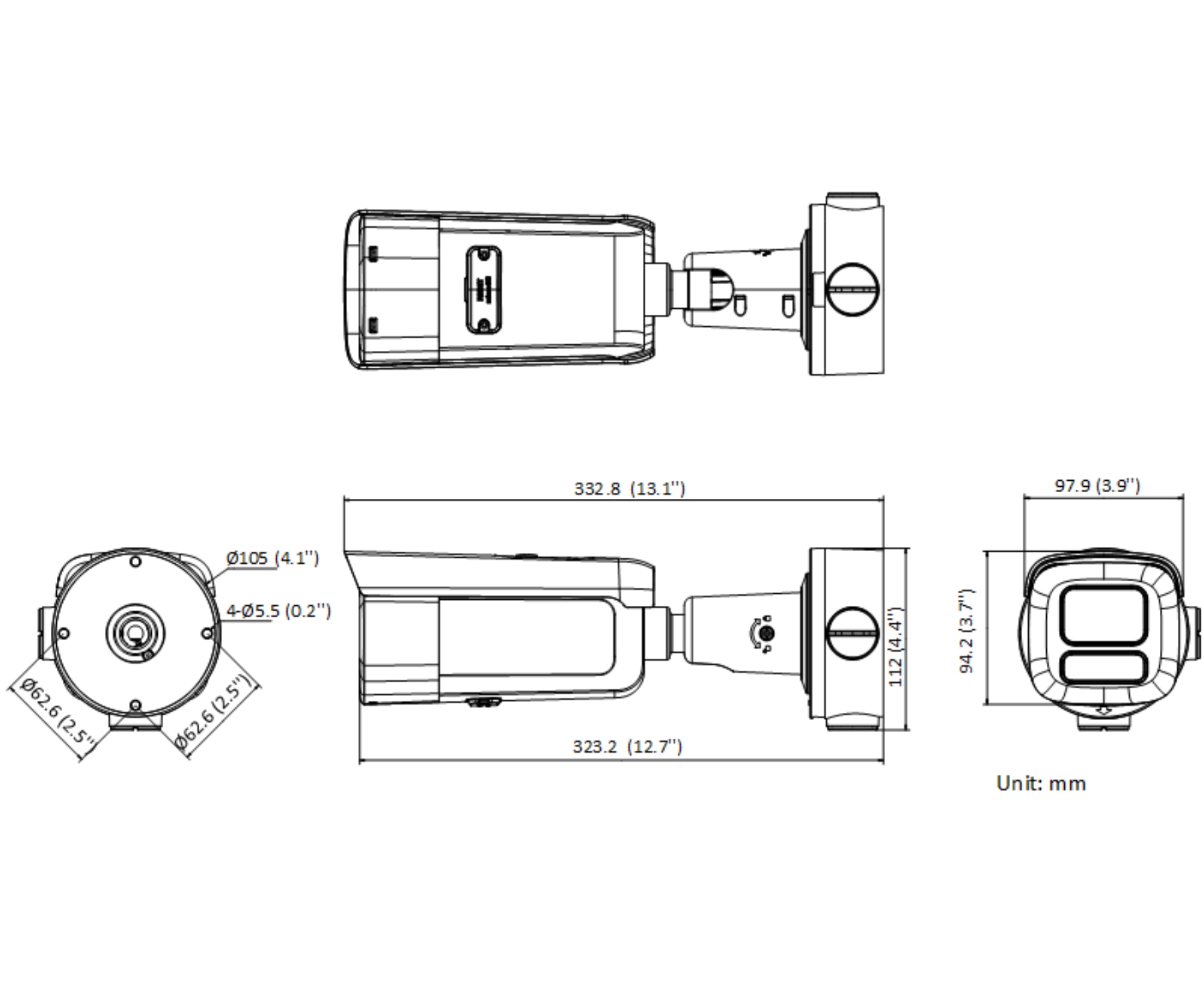 Resolution: 3840 × 2160 ; Sensor: 1/2.8 " ; View angle: 106 ° ... 30 ° ; White light LED illuminator range: 60 m ; Range of IR illumination: 60 m ; Memory card slot: Micro SD card support up to 512GB ; Audio: Microphone built-in - Dual microphone in series, Speaker built-in, Compliance with the AAC standard ; Power supply: PoE (802.3at), 12 V DC ;