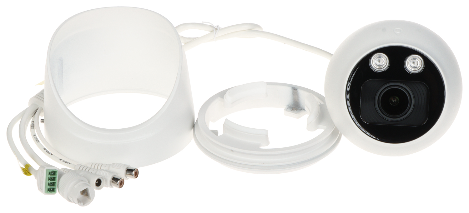 Resolution: 3840 x 2160, 3072 x 2048, 2592 x 1536, 2560 x 1440, 1920 x 1080 ; Sensor: 1/2.8 " SONY Starvis™ Back-illuminated CMOS ; View angle: 103 ° ... 29 ° ; White light LED illuminator range: 25 m ; Memory card slot: Micro SD memory cards up to 1TB support (possible local recording) ; Image compression method: H.265+ ; Alarm inputs / outputs: 1 / 1 ; Audio: Audio input, Audio output, Compliance with the AAC standard ; Power supply: PoE (802.3af), 12 V DC ;