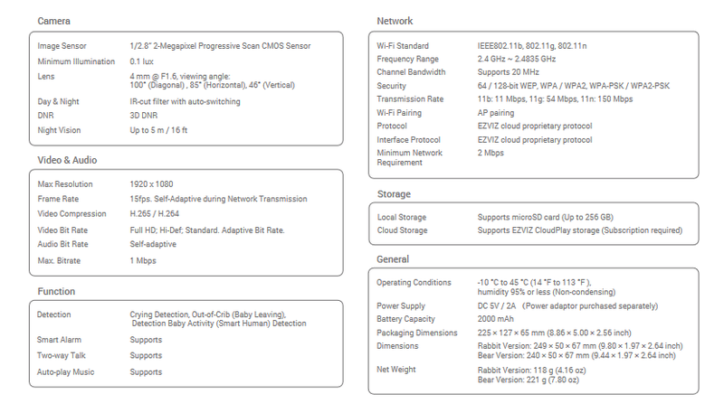 Обнаружение плача Обнаружение активности ребенка (на основе алгоритма человеческого тела) Автоматическое воспроизведение успокаивающей музыки Аккумулятор на всю ночь (2000 мАч) Четкое ночное видение без видимого красного света Просмотр из любого места с разрешением 1080p FHD Слушай и говори Простая настройка Интеллектуальная интеграция с Google Assistant и Amazon Alexa Поддержка карт MicroSD (до 256 ГБ) и облачного хранилища EZVIZ Строгая защита данных и конфиденциальности