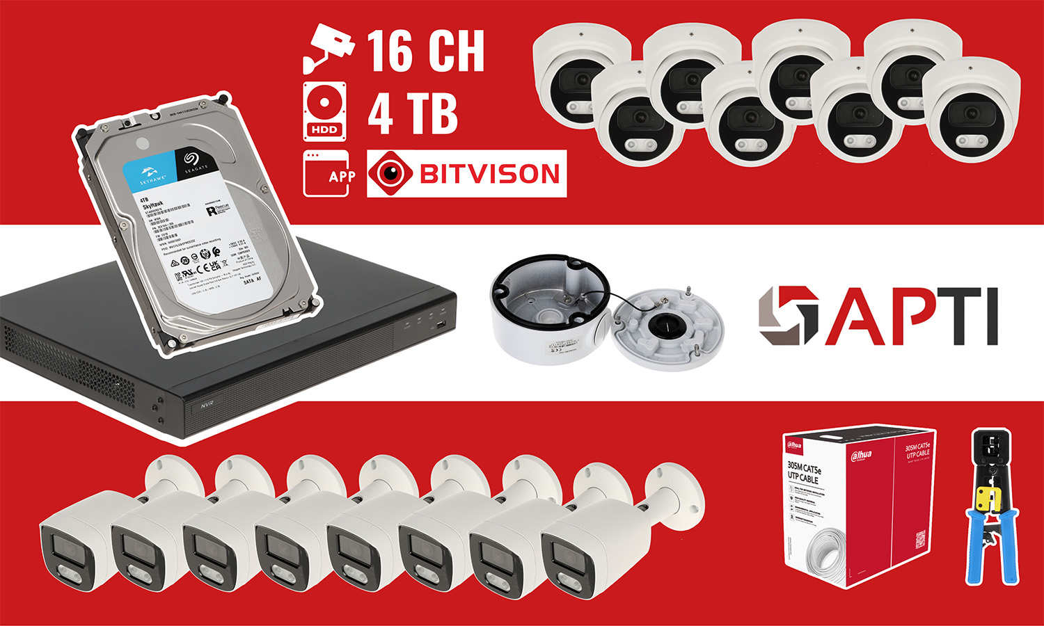 The kit consists of a DVR, a 4 TB hard drive, 8 bullet cameras, 8 dome cameras, a 305 m long twisted pair cable, a set of RJ45 plugs and a crimping tool; Standard: IP ; Audio support: 16 Channels ; Image compression method: H.265+ ; Resolution: 2688 x 1512 - 4 Mpx ; Designed to continuous operation 24/7;