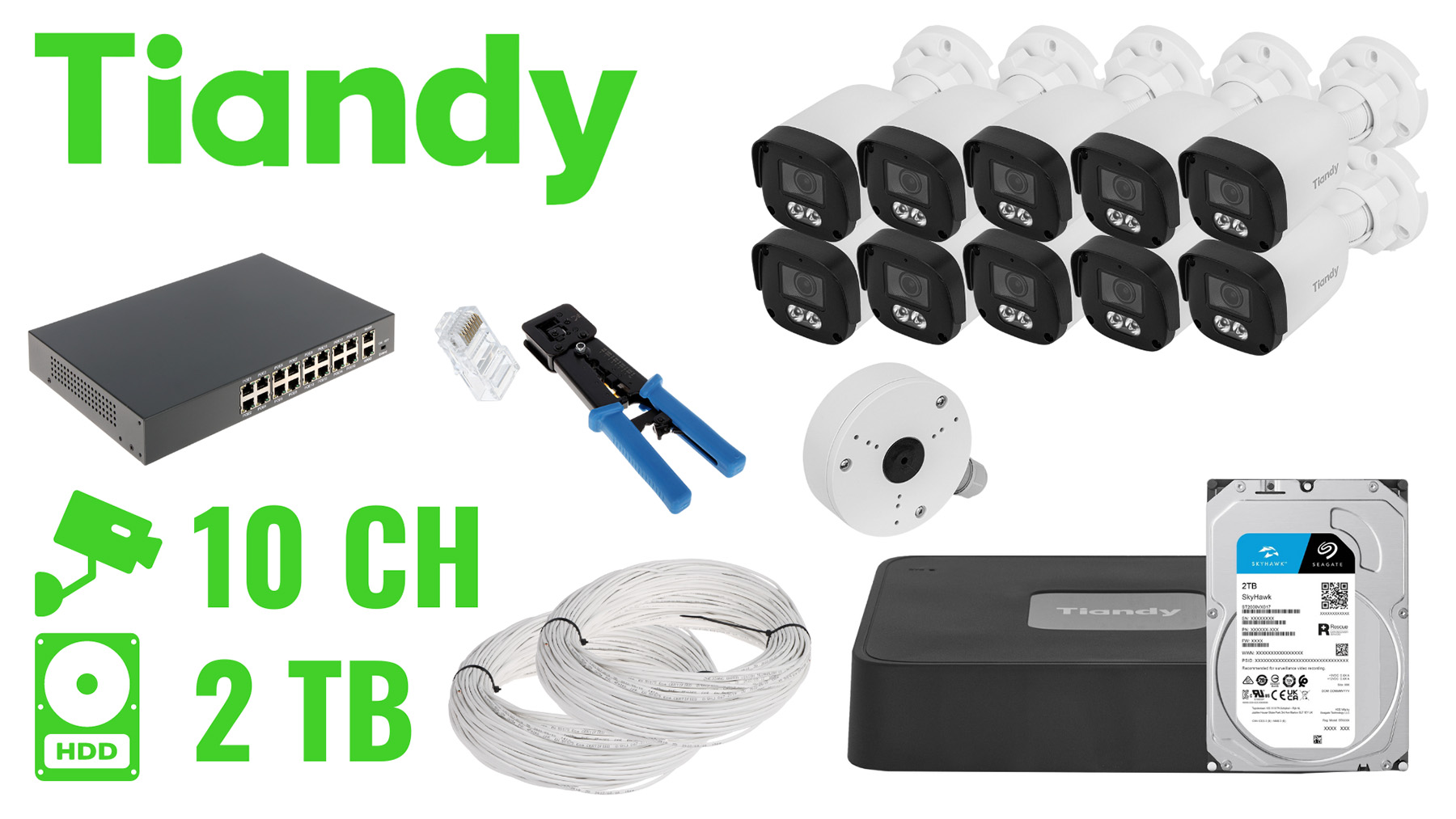 The kit consists of a DVR, a 2 TB hard drive, 10 tube cameras, a PoE switch, a 200 m long twisted-pair cable, a set of RJ45 plugs and a crimping tool; Supported resolutions: max. 6 Mpx ; Image compression method: S+265 ; Audio: Audio transmission via network ; Designed to continuous operation 24/7; Standard: IP ;