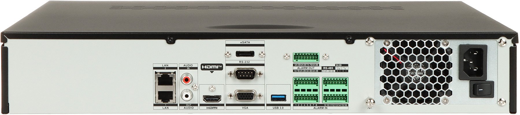 Supported resolutions: 12 Mpx ; Supported hard drives: 4 x 16 TB SATA + 1 x eSATA ; Image compression method: H.265+ ; Alarm inputs / outputs: 16 / 9 ;