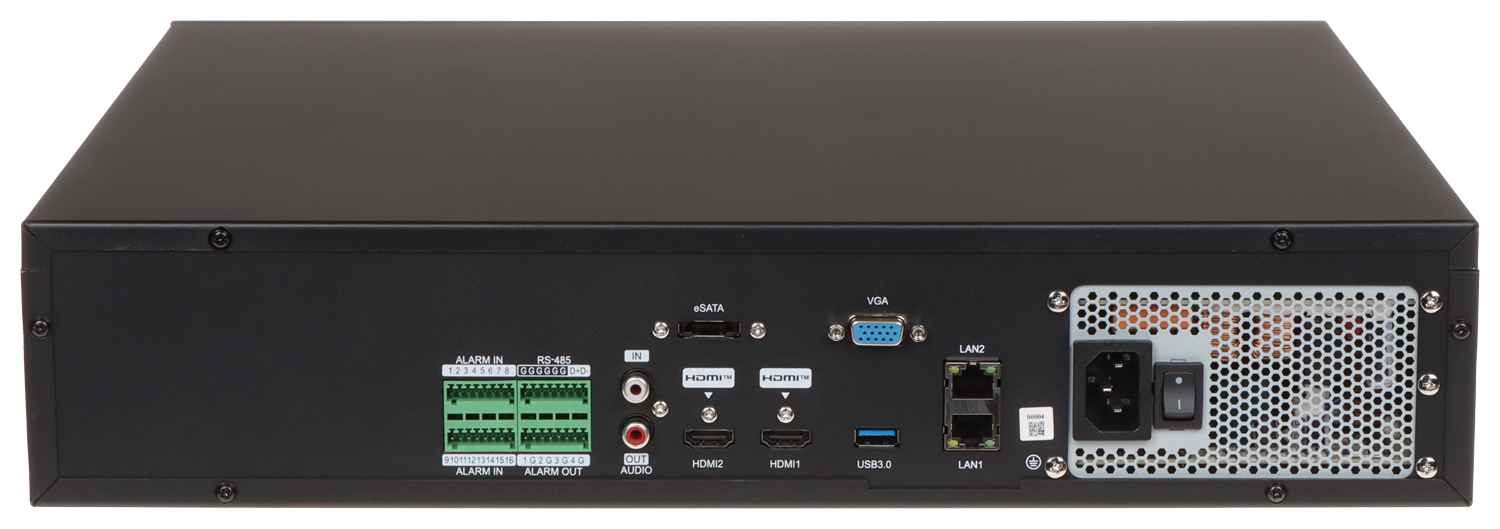 Supported resolutions: max. 12 Mpx - 4000 x 3000 px ; Audio support: 64 Channels, Compliance with the AAC standard ; Image compression method: H.265+ ; Supported hard drives: 8 x 10 TB SATA + 1 x eSATA ; Alarm inputs / outputs: 16 / 4 ;
