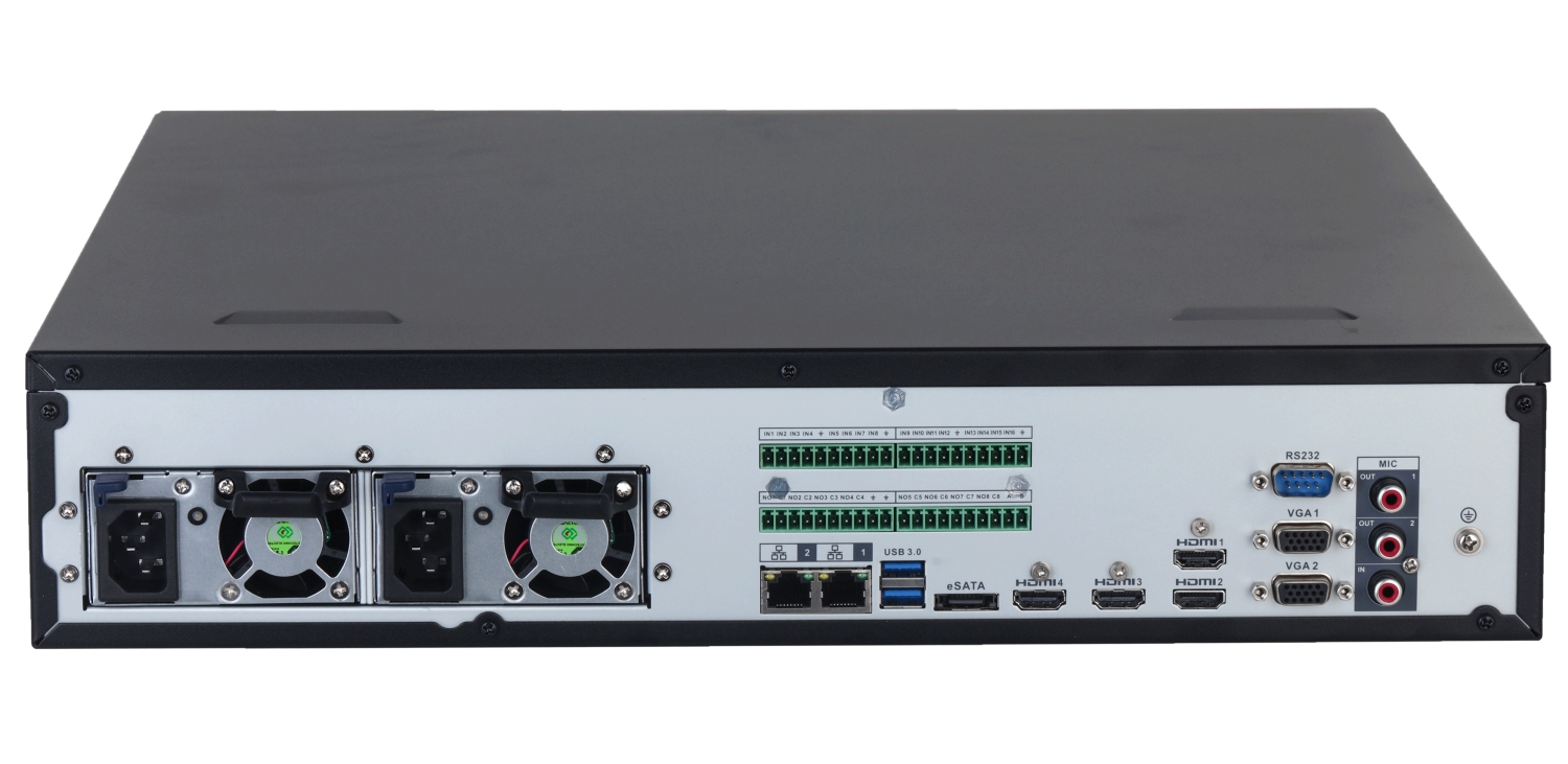 NVR equipped with advanced functions of intelligent image analysis; Supported resolutions: max. 32 Mpx ; Audio support: 32 Channels - Audio from cameras, ; Audio inputs: 1 pcs CINCH ; Audio outputs: 2 pcs CINCH ; Image compression method: Smart H.265+ ; Supported hard drives: 8 x 16 TB SATA + 1 x eSATA, Raid 0/1/5/6/10 ; Alarm inputs / outputs: 16 / 8 ; Main features: Intelligent Image Analysis, face detection, Face recognition ; Power supply: Redundant power supply ;