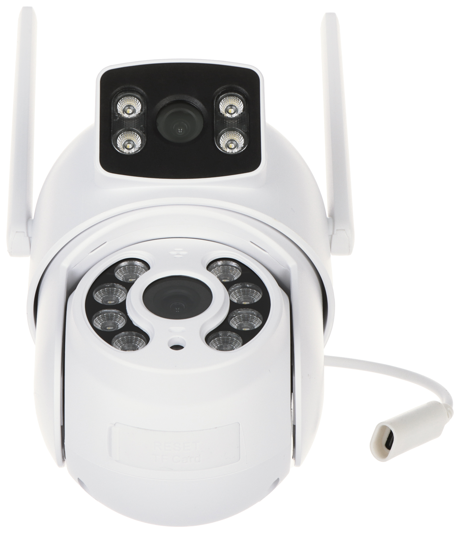 Camera working with the Tuya platform; Resolution: : 1920 x 1080, Camera 2 : 1920 x 1080 ; Range of IR illumination: 50 m ; White light LED illuminator range: 50 m ; Horizontal rotation range: 0 ° ... 355 ° Rotation of the head is limited by stops ; Vertical rotation range: 0 ° ... 90 ° ; Audio: Bi-directional audio streaming support ; Image compression method: Smart H.265+ ; Memory card slot: Micro SD card support up to 128GB ; Main features: Wi-Fi Module - IEEE 802.11 b/g/n ; Power supply: 5 V DC / 1 A ;