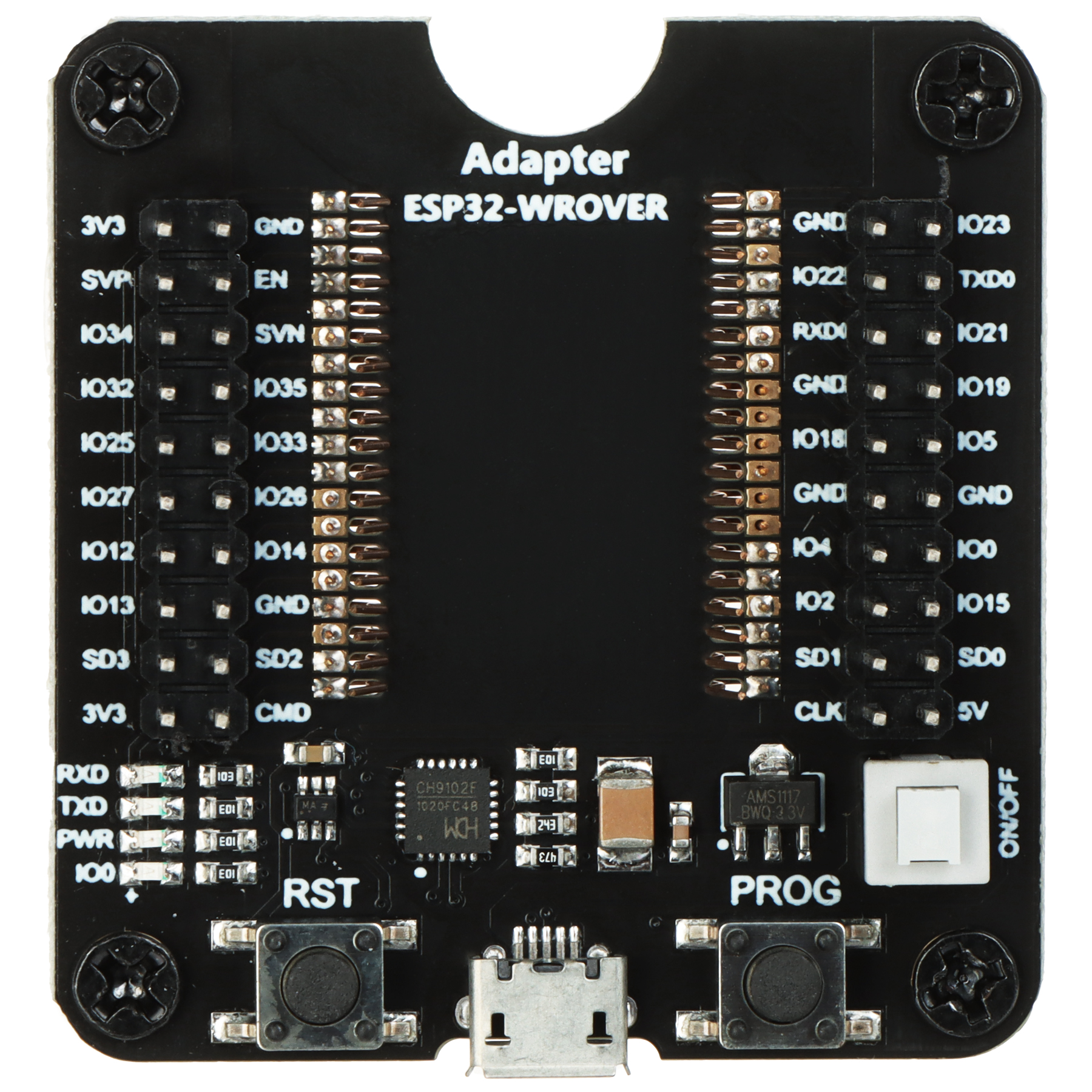 Compatibility: ESP32-WROVER-32 ; Connectors type: 1 x micro USB socket, Place of temporary installation of the board with spring pins 40 x goldpin plug ; Output signal level: 3.3 V ; Power output: 3.3 V, 5 V ; Main features: RESET button, PROGRAM button ; Power supply: 5 V - from USB port ; Dimensions: 49 x 46 x 15 mm ;