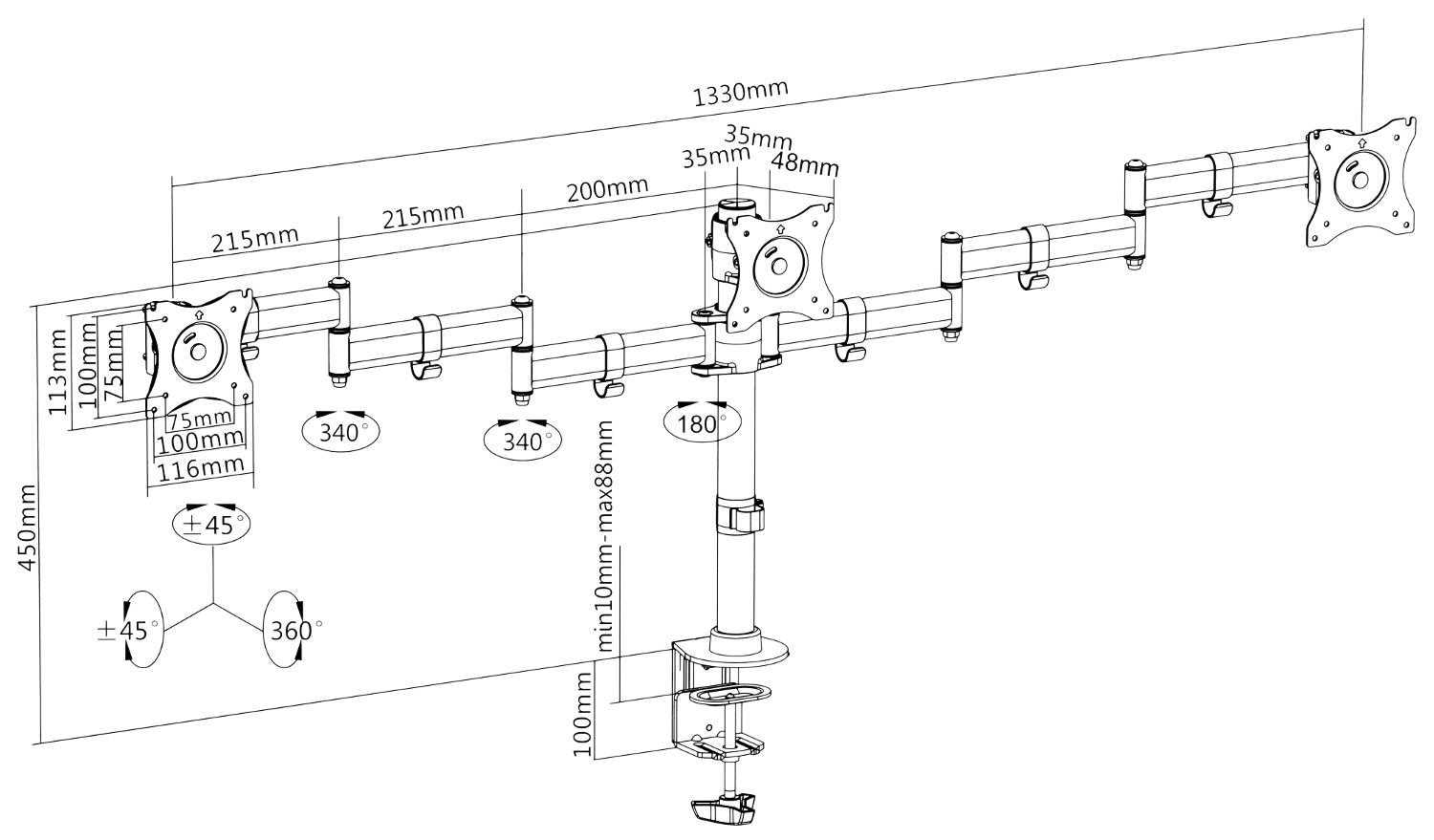 The MC-691 mount enables fixing 3 LCD monitors to the desk or other flat surfaces; Screen size range: 13 " ... 27 " ; Bearing capacity: 8 kg ;