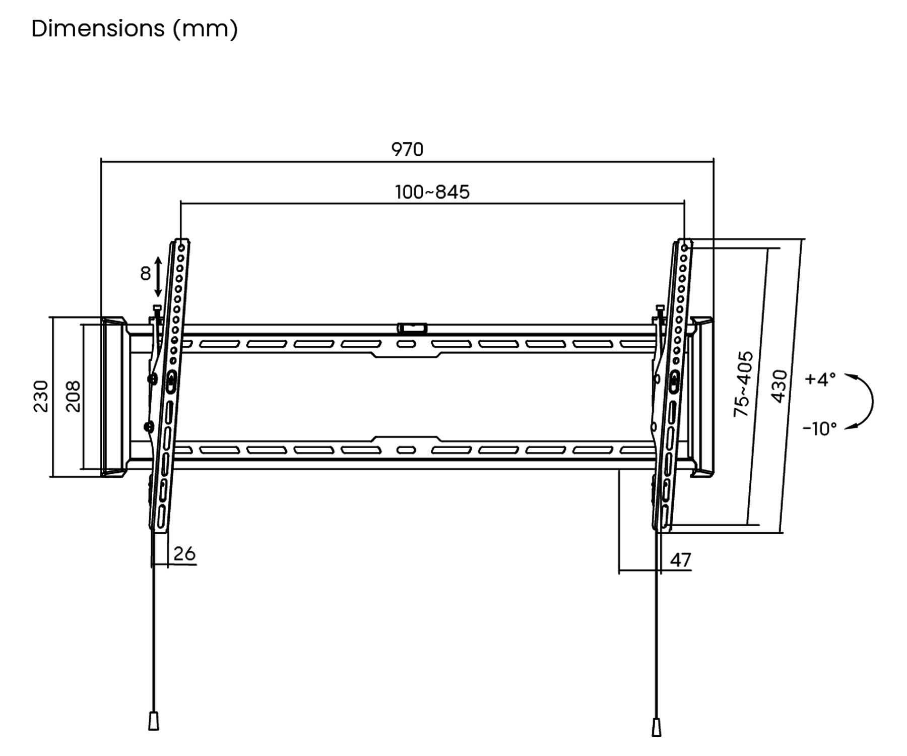 Screen size range: 43 " ... 90 " ; Bearing capacity: 75 kg ; Distance from mounting surface: 47 mm ; Tilt adjustment: -10 ° ... 4 ° ;