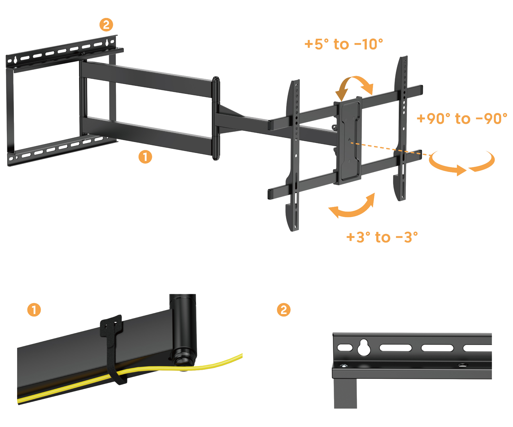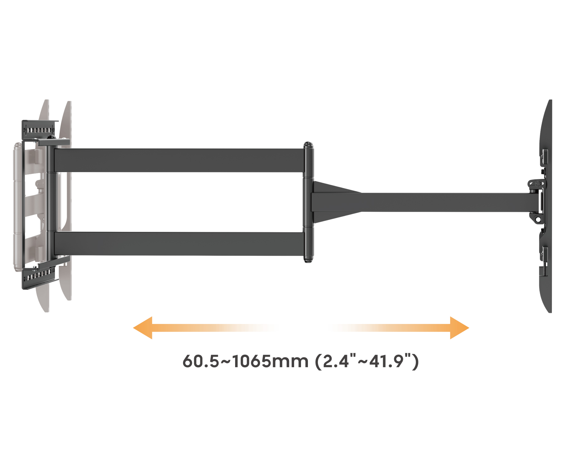 Mounting standard: : 200x200, 300x200, 400x200, 300x300, 400x300, 400x400, 600x400 ; Screen size range: 43 " ... 80 " ; Bearing capacity: 50 kg ; Distance from mounting surface: 60.5 ... 1065 mm ; Tilt adjustment: -10 ° ... 5 ° ; Horizontal rotation: -90 ° ... 90 ° ;