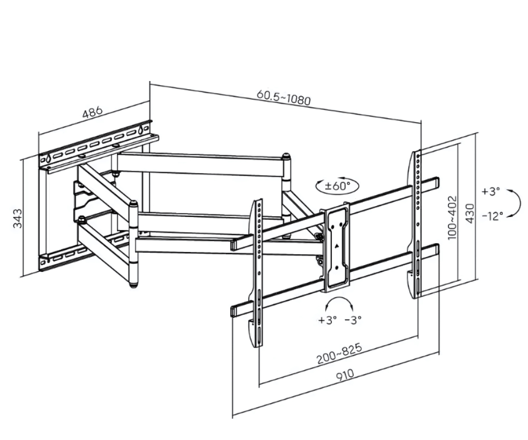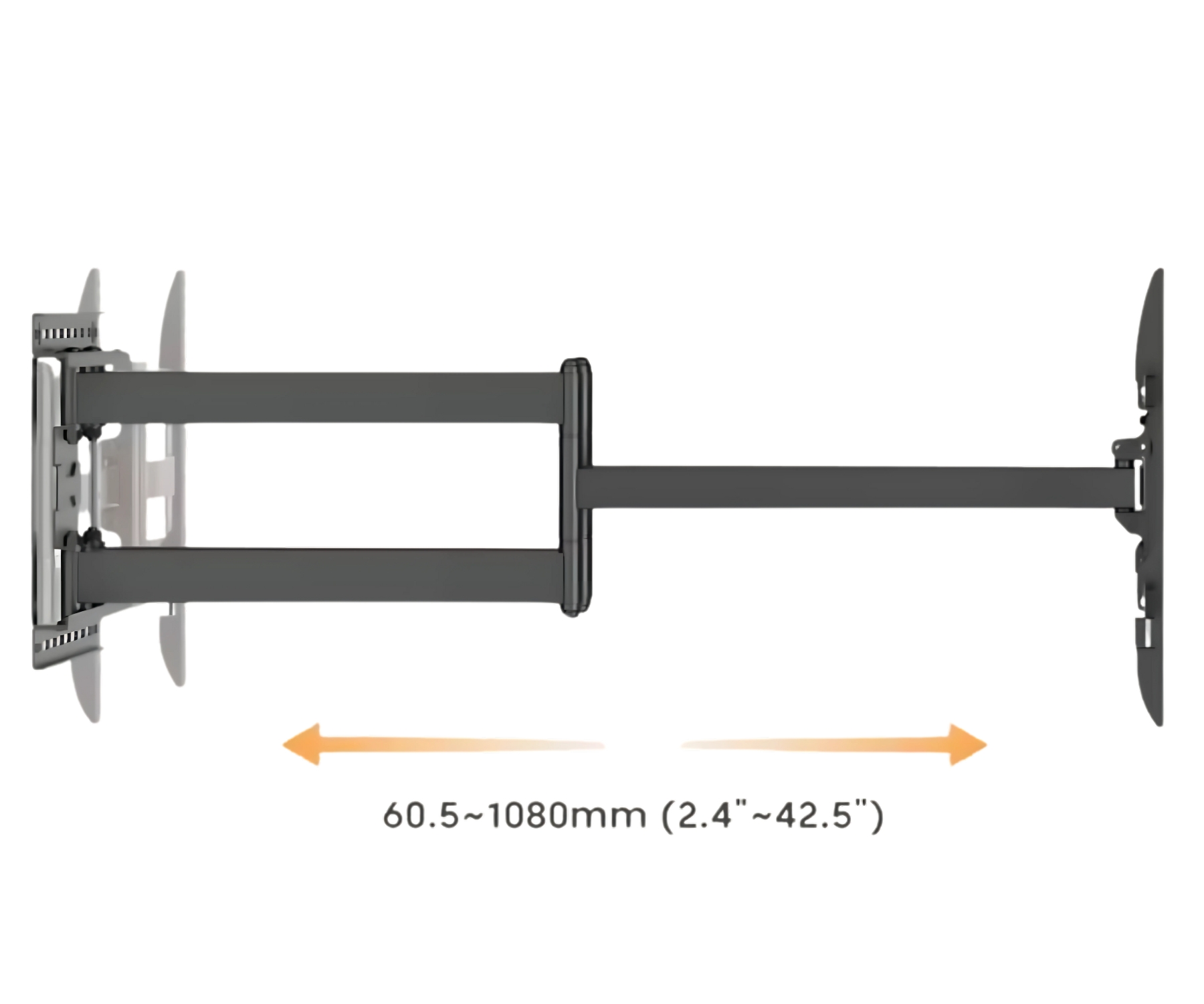 Mounting standard: : 200x200, 300x200, 400x200, 300x300, 400x300, 400x400, 600x400, 800x400 ; Screen size range: 43 " ... 90 " ; Bearing capacity: 60 kg ; Distance from mounting surface: 60.5 ... 1080 mm ; Tilt adjustment: -12 ° ... 3 ° ; Horizontal rotation: -60 ° ... 60 ° ;