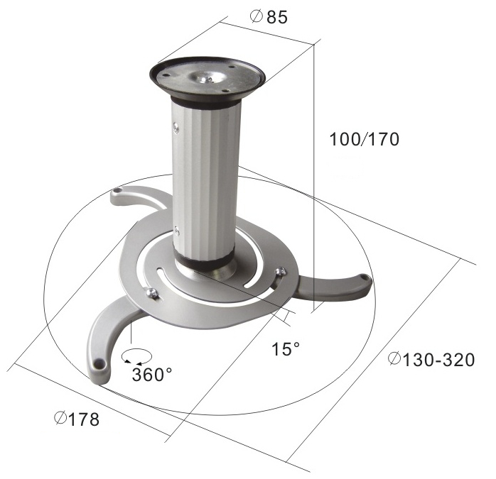 Possibility to mount under slanted ceiling; Bearing capacity: 10 kg ; Distance from mounting surface: 100 mm or 170 mm from ceiling ; Projector mounting holes distances: Ø 130 ... 320 mm ;