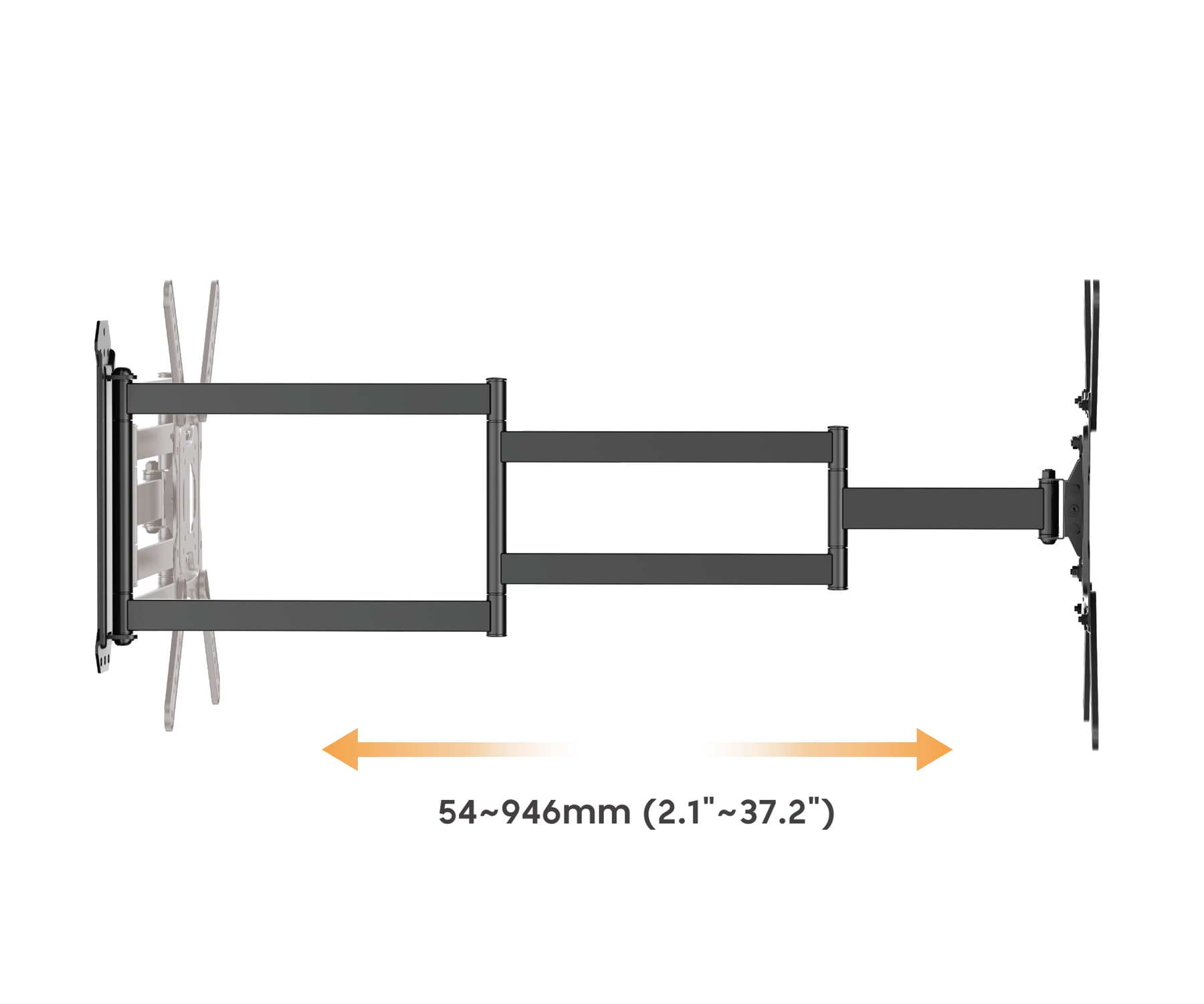 Mounting standard: VESA : 75x75, 100x100, 200x200, 300x200, 400x200, 300x300, 400x300, 400x400 ; Screen size range: 23 " ... 65 " ; Bearing capacity: 35 kg ; Distance from mounting surface: 54 ... 946 mm ; Tilt adjustment: -15 ° ... 5 ° ; Horizontal rotation: -90 ° ... 90 ° ;