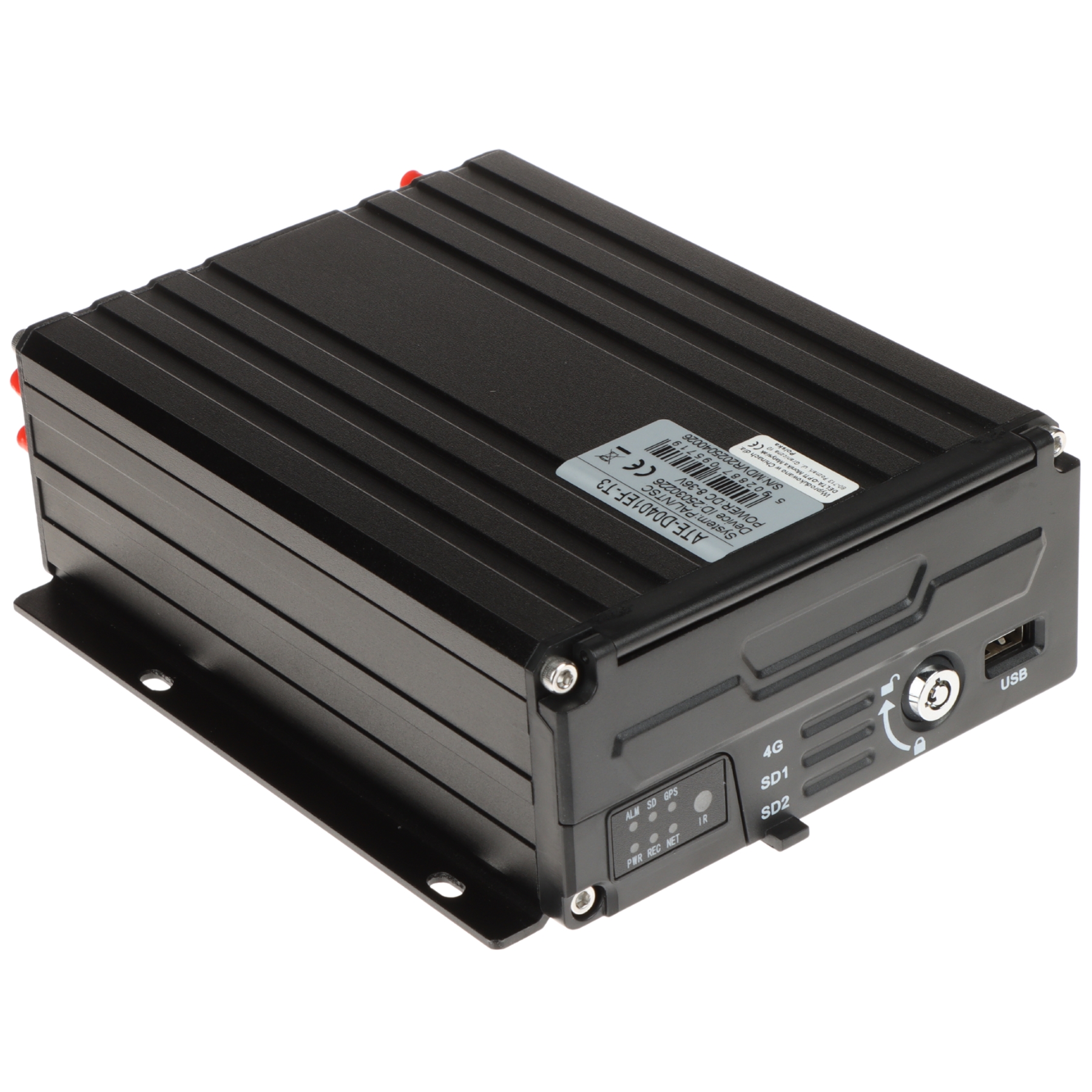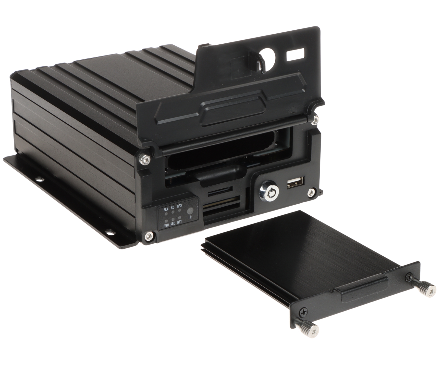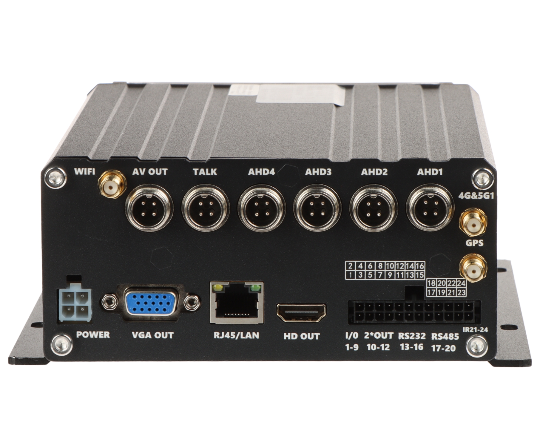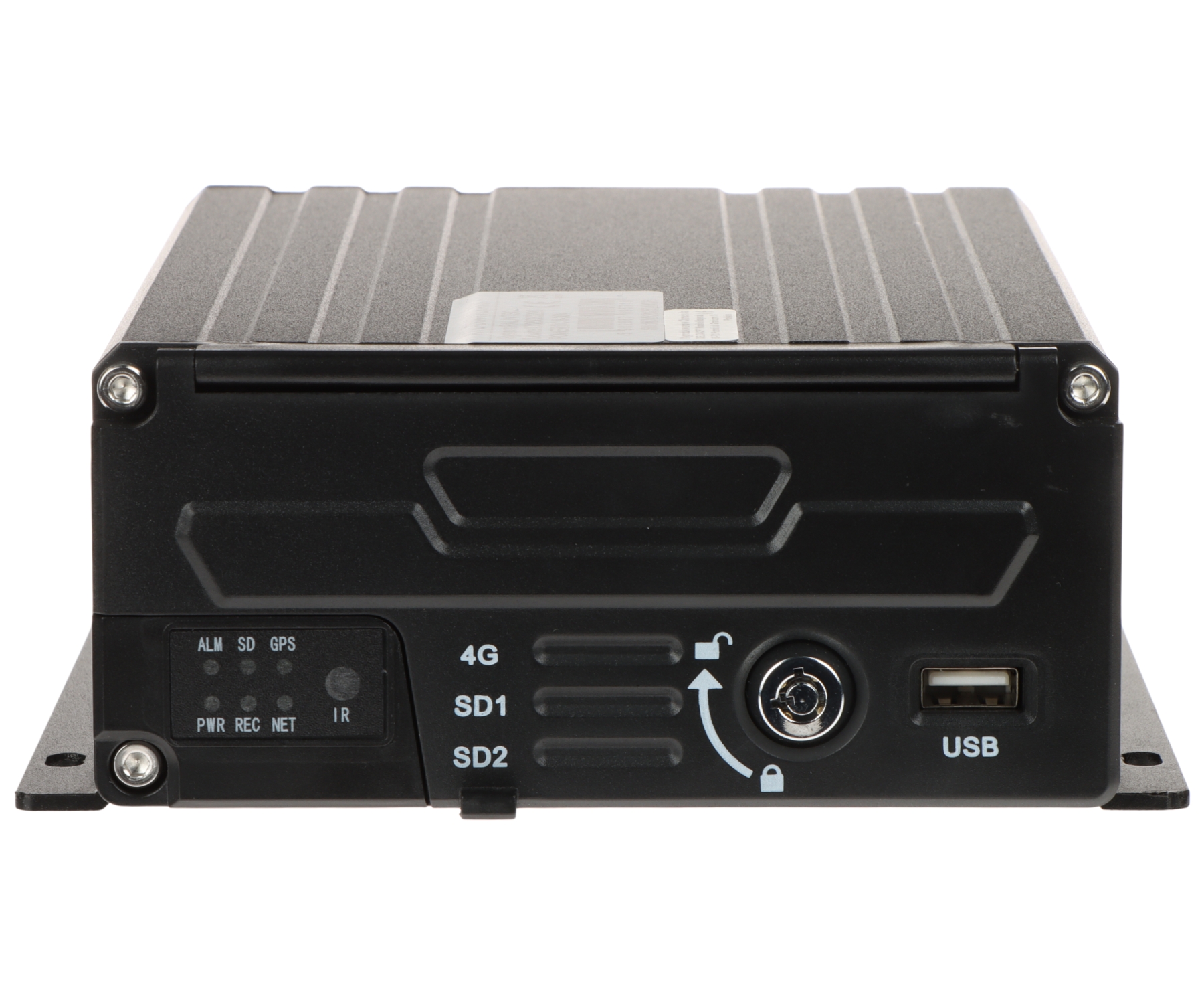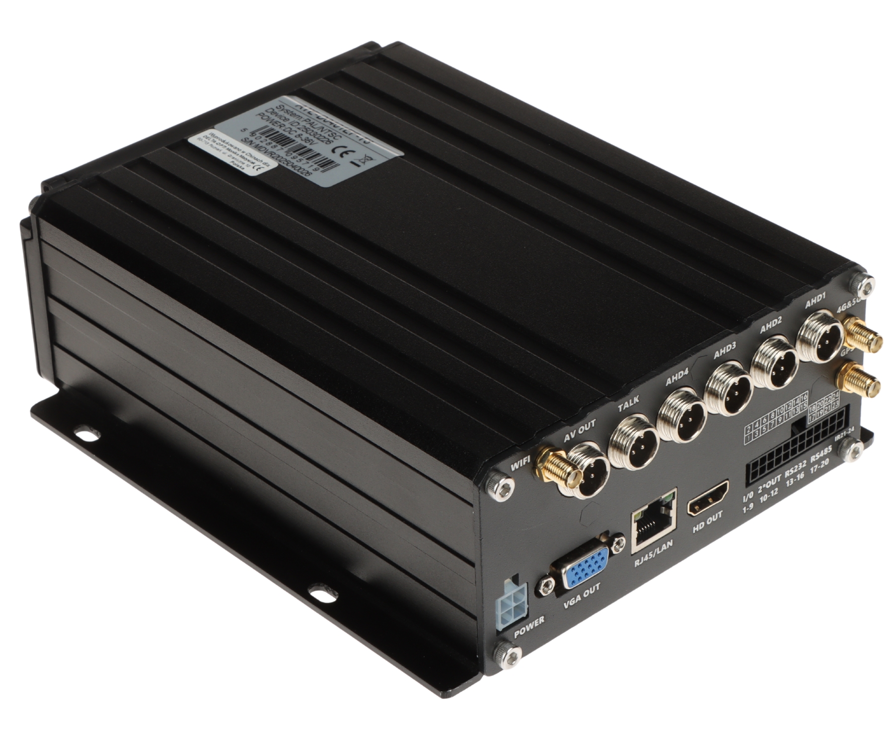 Resolution: 1920 x 1080 ; Video inputs: 4 pcs M12, 4-pin plug ; Video outputs: 1 pcs HDMI, 1 pcs VGA, 1 pcs CVBS ; Audio inputs: 4 pcs ; Audio outputs: 1 pcs ; Resolution of recording video files: 1920 x 1080, 1280 x 720, 720 x 576 ; Max. capacity of memory card: 2 x 256 GB SD/SDHC ; Supported hard drives: 1 pcs 2.5 " - 2 TB SATA ; GPS; G-Sensor; SIM socket: 1 x mini SIM ; microSD socket: 2 x ; RS-485; RS-232; USB port; Ethernet port: 1 x RJ-45 ; Wi-Fi; Alarm inputs / outputs: 8 / 1 ; Operation temp: -20 °C ... 70 °C ;