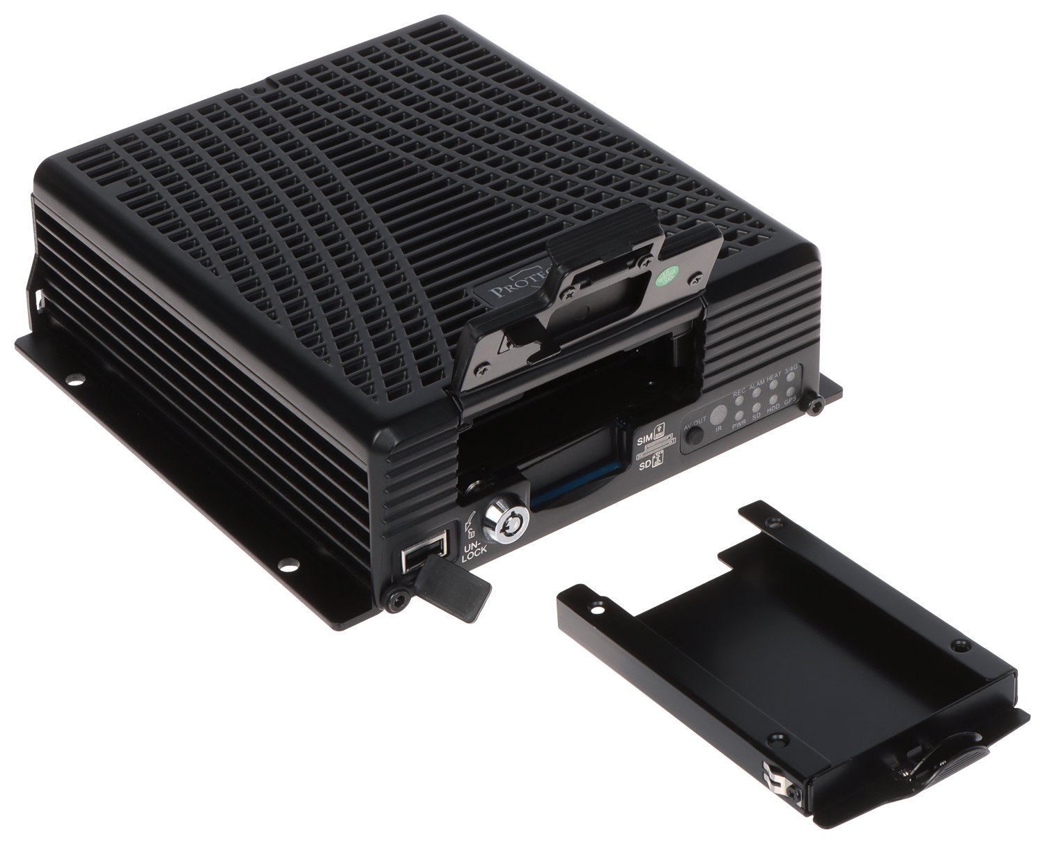 Resolution of recording video files: 1920 x 1080, 1280 x 720, 960 x 576, 720 x 576, 704 x 576 px ; Maximal total frame rate: 100 fps @ 4 x AHD 1080p, 100 fps @ 4 x CVBS 960H, 25 fps @ 1 x IP 1080p ; Supported hard drives: 1 x 2 TB HDD / SSD 2.5 " ; GPS; G-Sensor: 3-axis ; Gyroscope: 3-axis ; Alarm inputs / outputs: 8 / 1 ; microSD socket; USB port: 1 x USB 3.0 ; Ethernet port: 1 x RJ-45 Passive PoE ; Power supply: 8 V ... 36 V DC ; Operation temp: -40 °C ... 80 °C ; Permissible relative humidity: 20 % ... 95 % RH ;