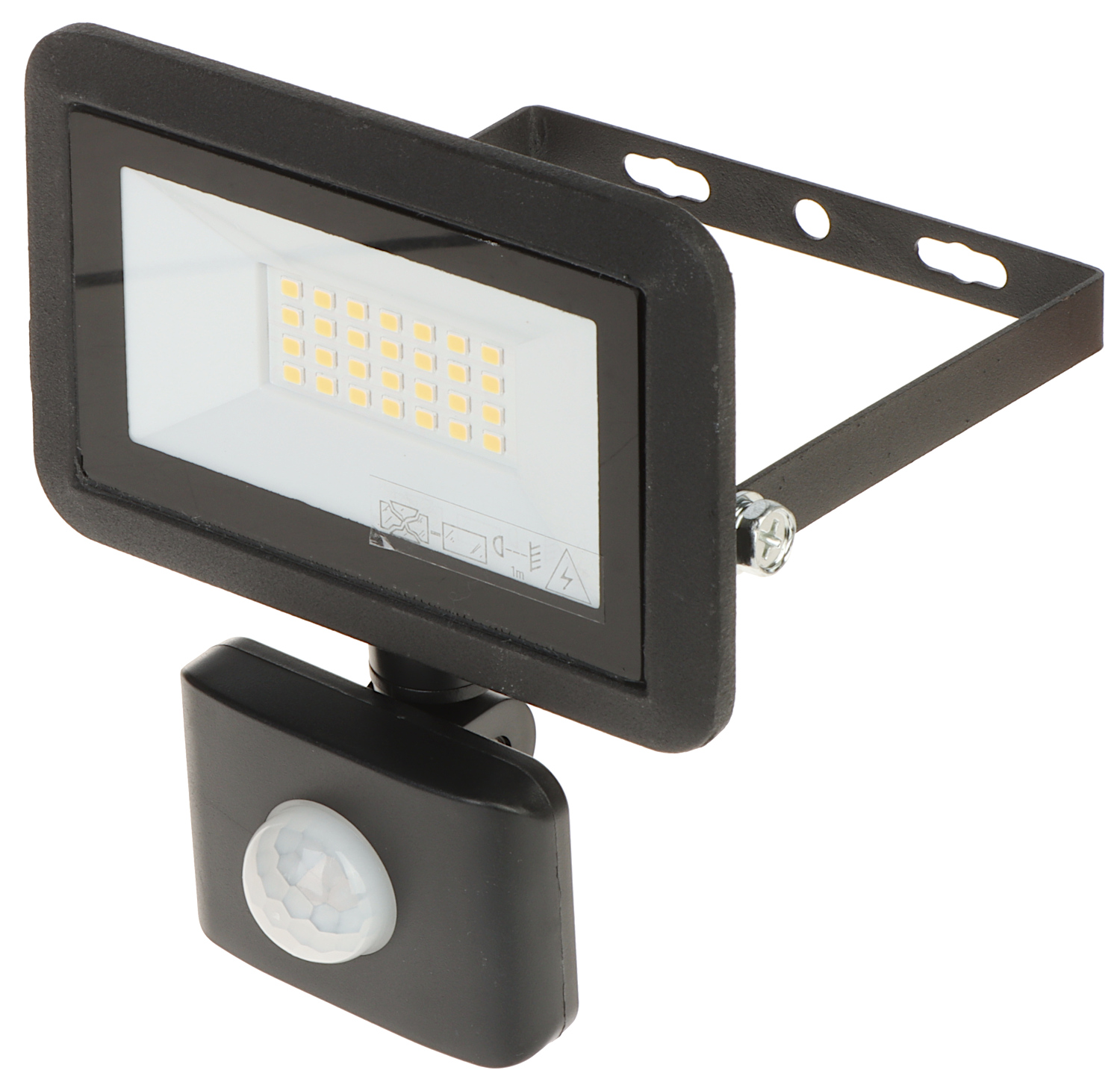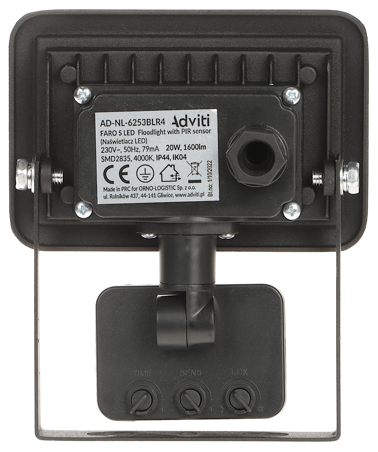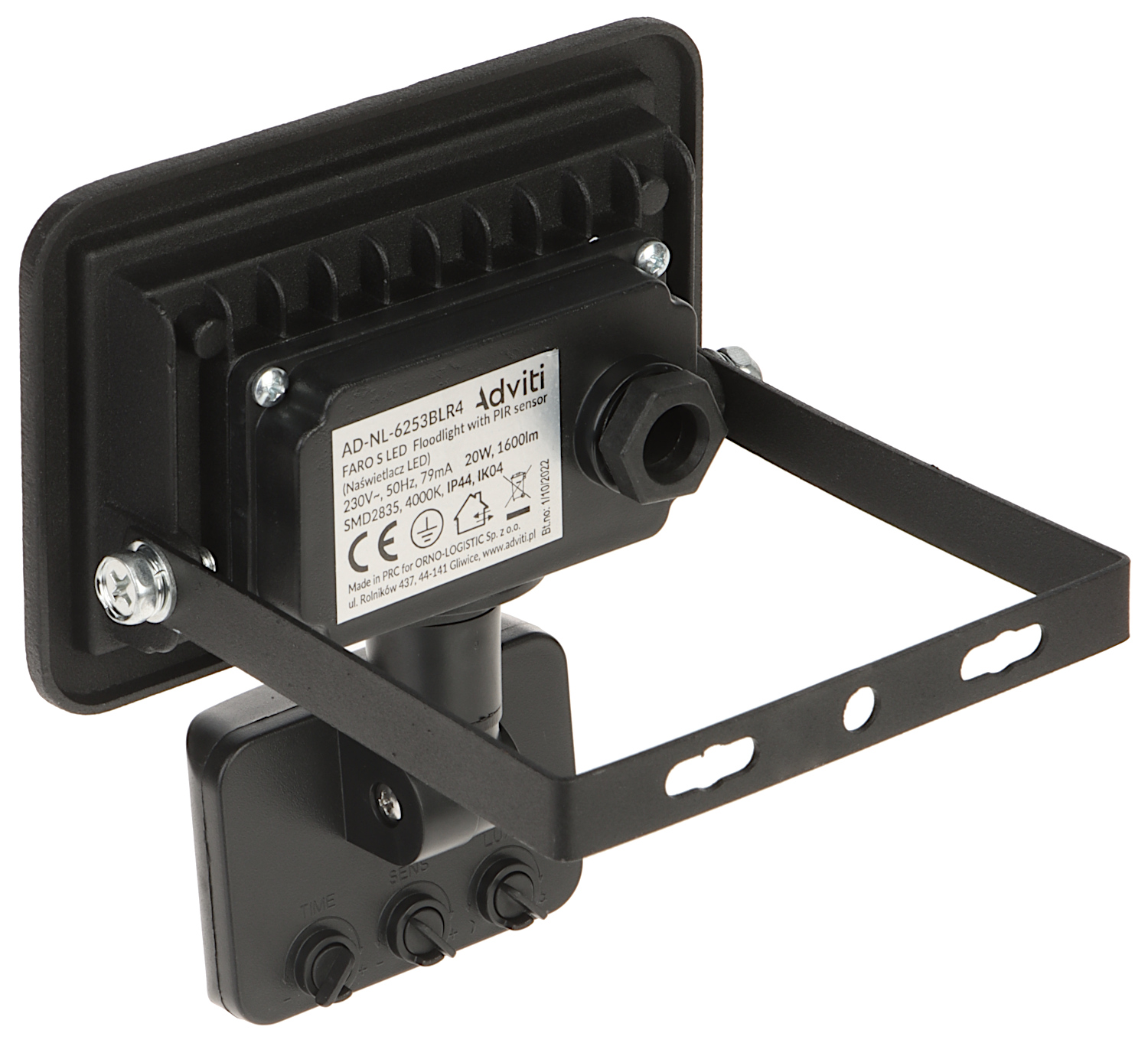 Luminous flux: 1600 lm ; Light color: Neutral, 4000 K ; Twilight switch; Power supply: 230 V AC ; Nominal power: 20 W ; Main features: PIR detector - Built-in, PIR detection sensitivity adjustment, Sensitivity adjustment of the twilight sensor, Lighting time adjustment, IK rating : IK04 ; "Index of Protection": IP44 ;