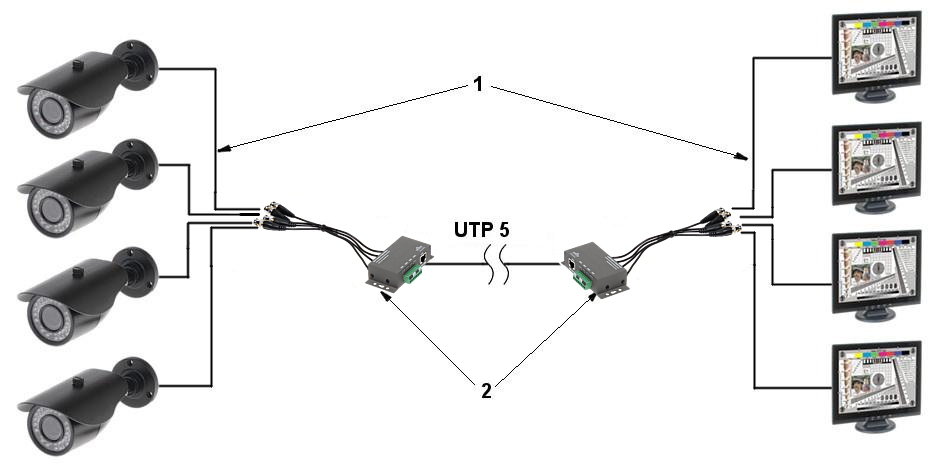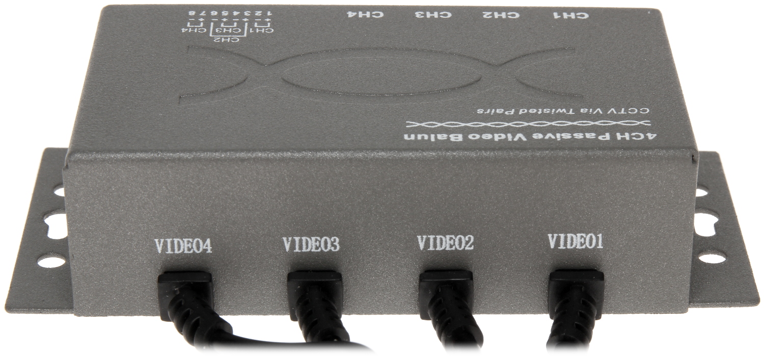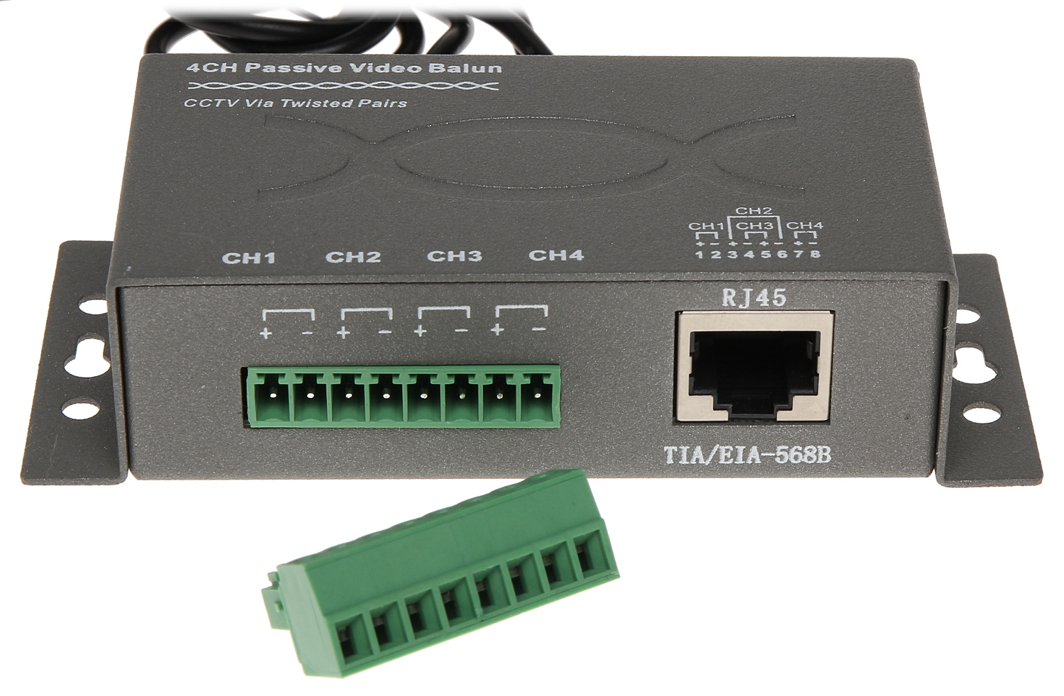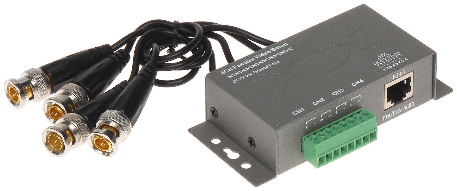 Standard: AHD - 5 Mpx, HD-CVI - 8 Mpx 4K UHD, HD-TVI - 8 Mpx 4K UHD, CVBS - PAL, NTSC ; Device type: Passive ; Number of channels: 4 pcs Video ; Symmetrical socket type: Cable terminals / RJ-45 (8-pin, 4 pairs) ;