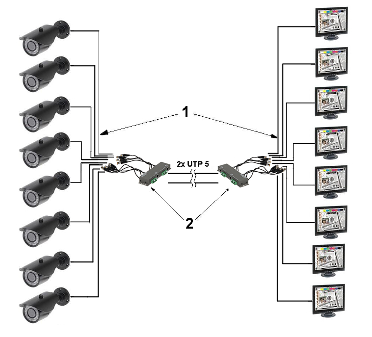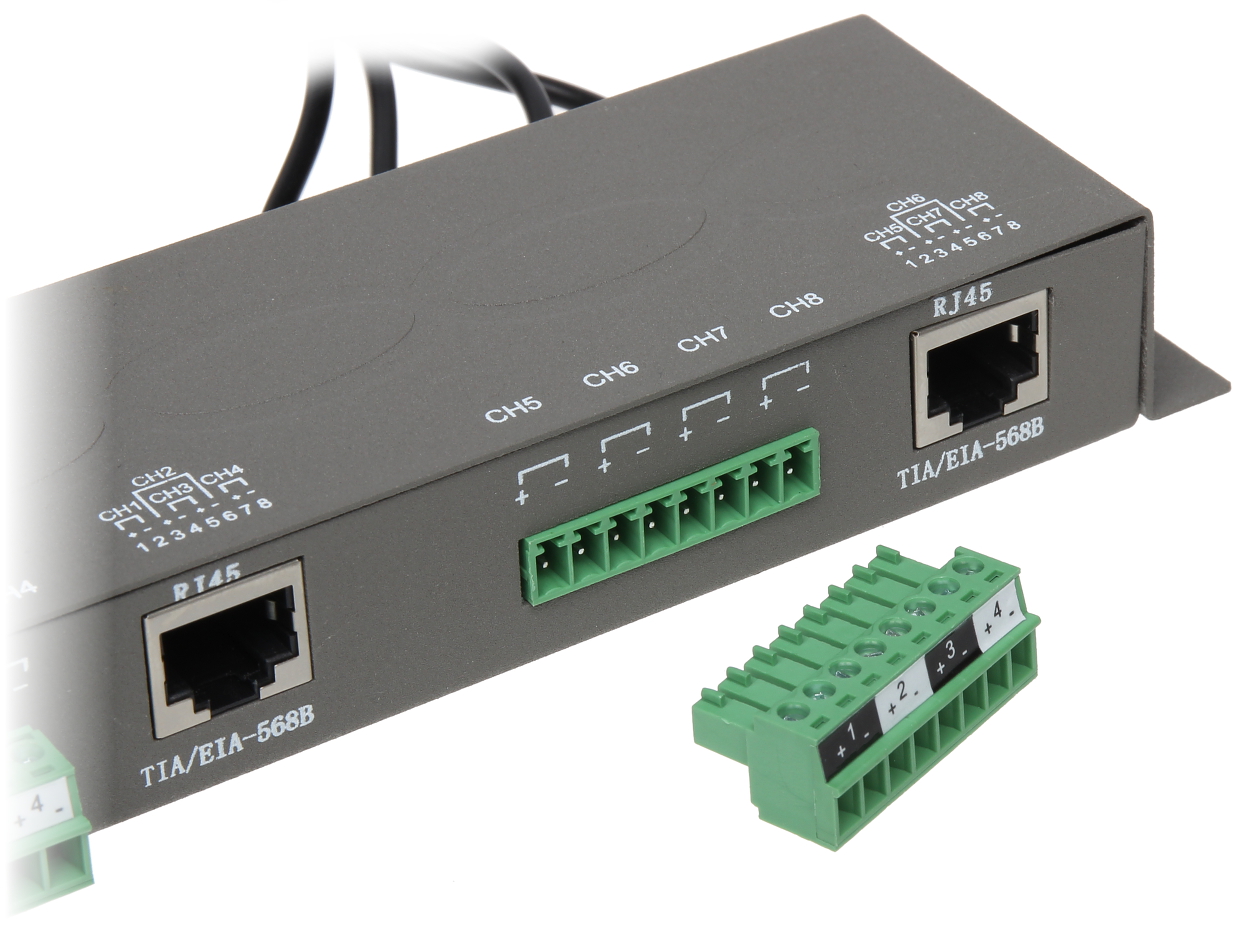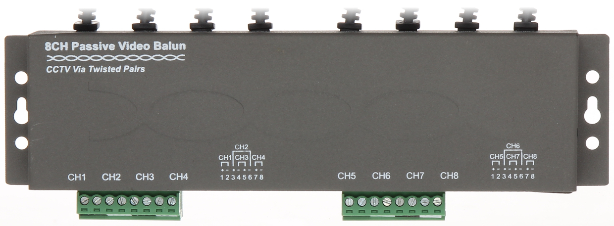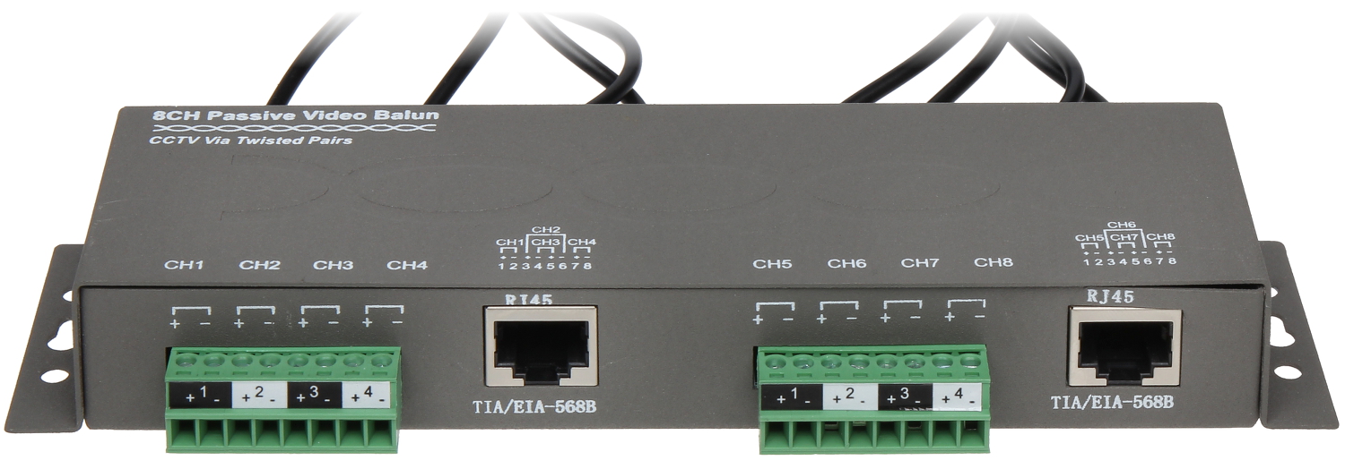 Standard: AHD - 5 Mpx, HD-CVI - 8 Mpx 4K UHD, HD-TVI - 8 Mpx 4K UHD, CVBS - PAL, NTSC ; Device type: Passive ; Number of channels: 8 pcs Video ; Symmetrical socket type: Cable terminals / 2 x RJ-45 (8-pin, 4 pairs) Socket ;
