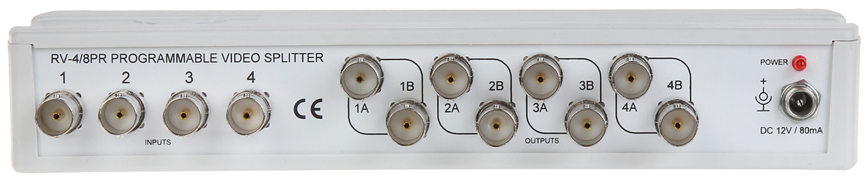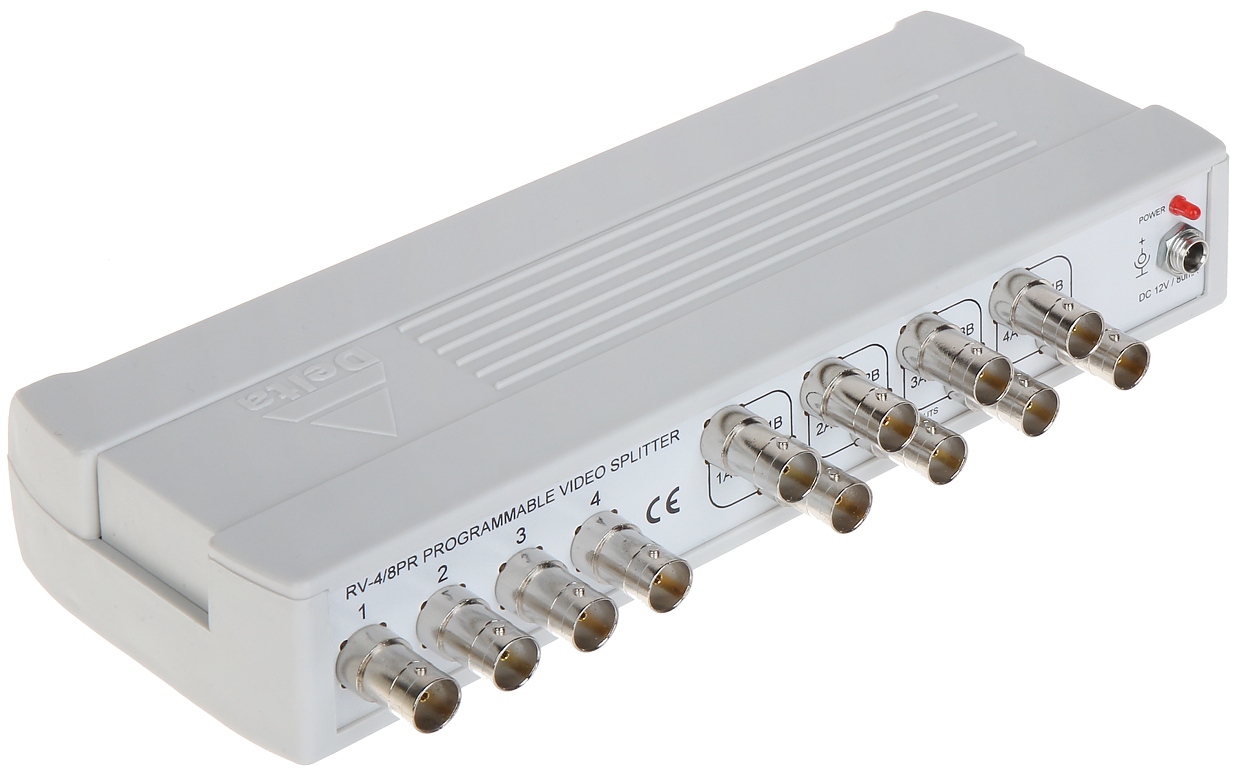 User programmable splitter; Standard: CVBS - PAL, NTSC ; Number of inputs: 4 pcs BNC ; Number of outputs: 8 pcs BNC ; Power supply: 12 V DC ;