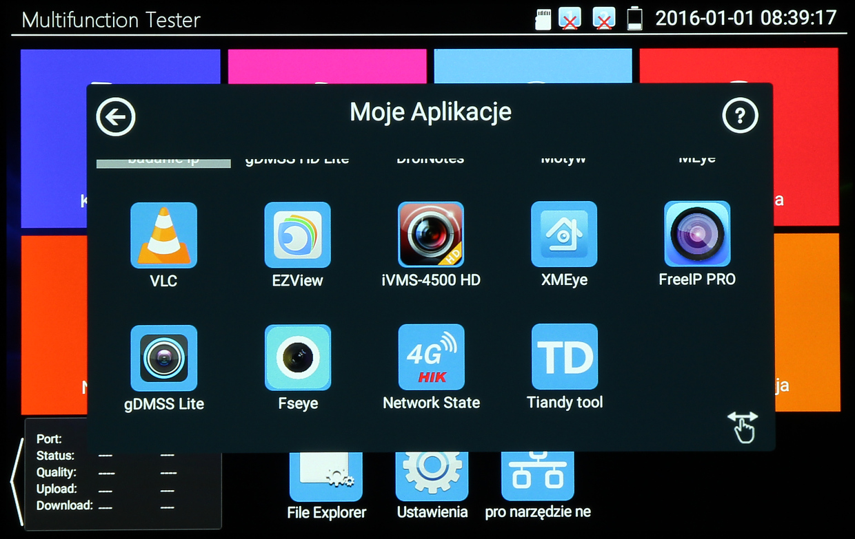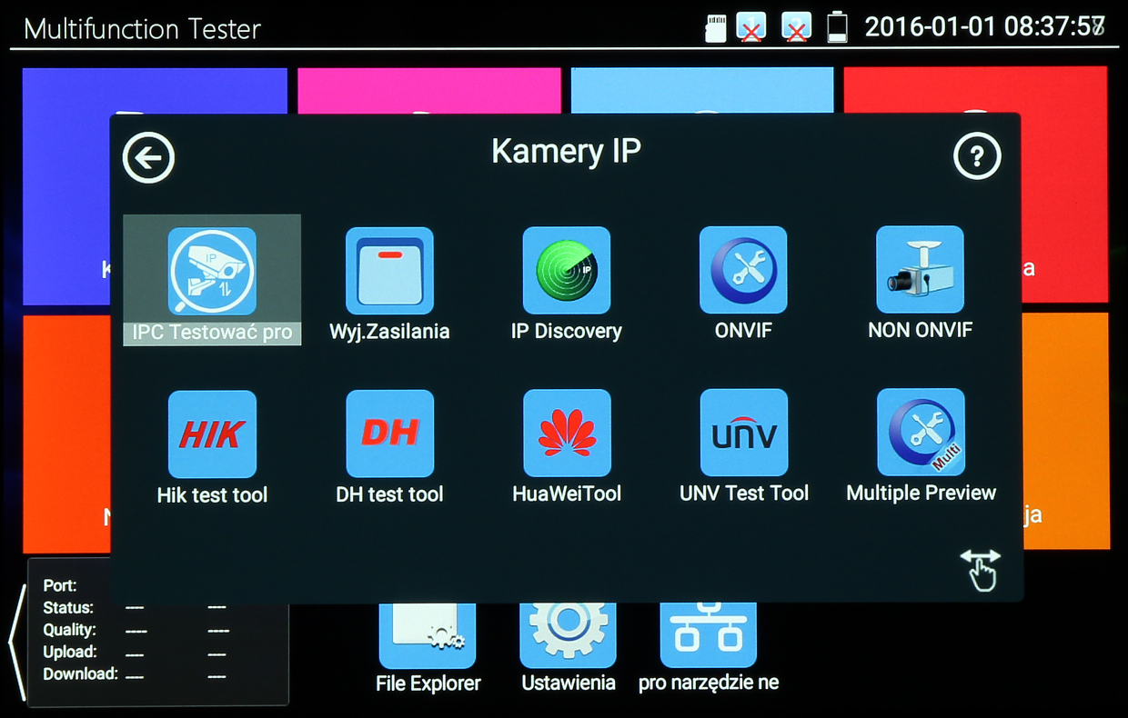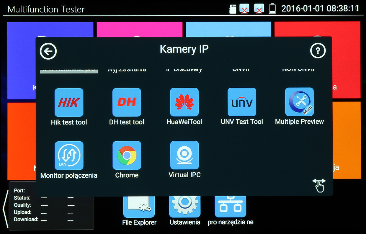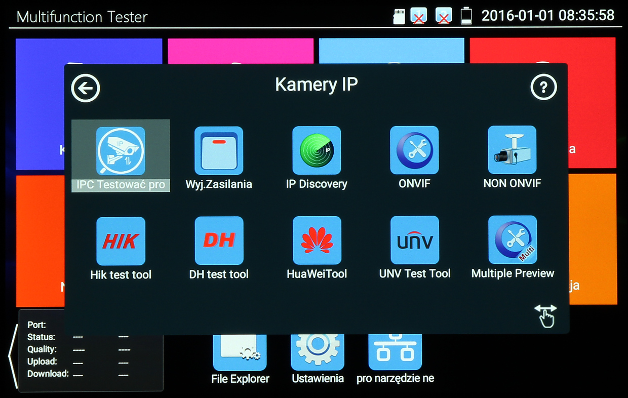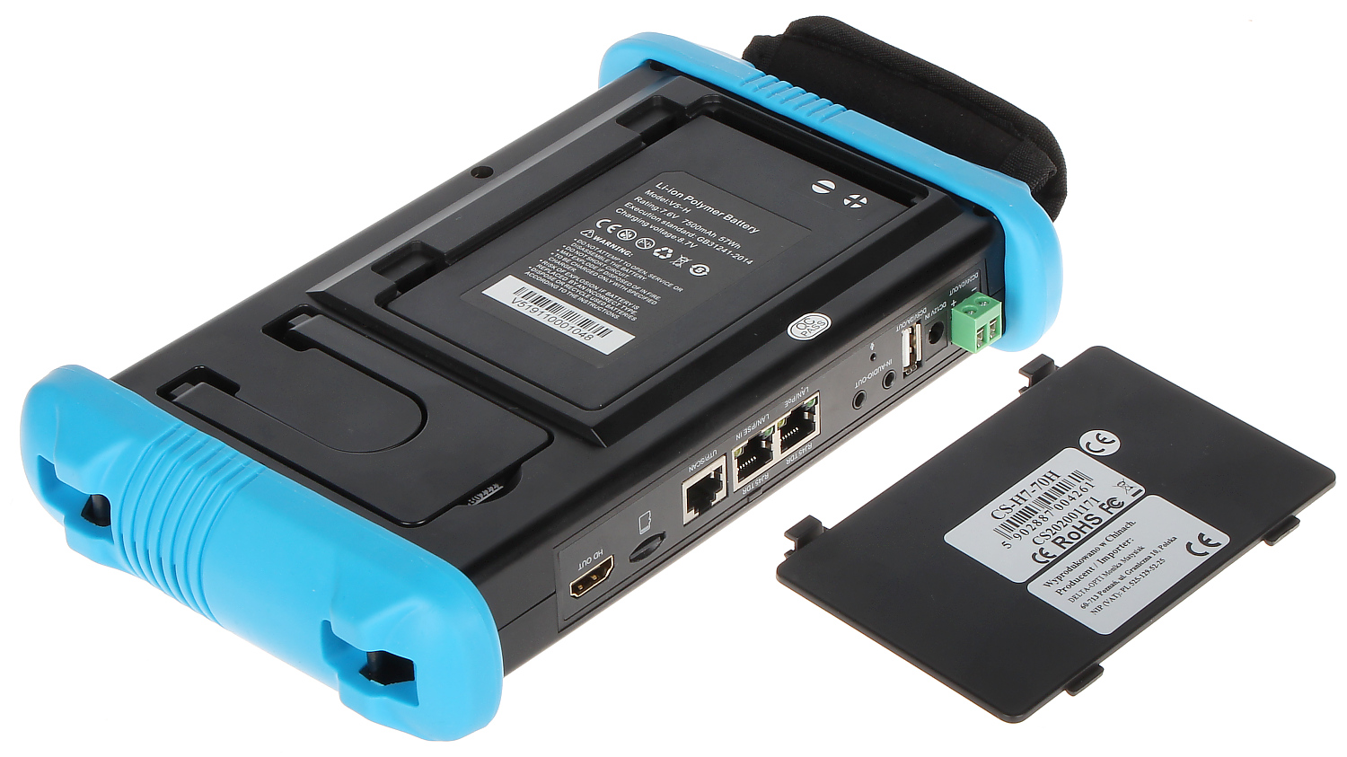 Video standard: AHD - 8 Mpx, HD-CVI - 8 Mpx, HD-TVI - 8 Mpx, TCP/IP - 4K, CVBS - PAL / NTSC ; Display: 7 " - capacitive touch screen, 1280 x 800 px ; Video input: 1 pcs AHD / HD-CVI / HD-TVI / CVBS - BNC socket 1 pcs HDMI ; Video output: 1 pcs CVBS 1 pcs HDMI ; LAN port: 2 pcs - PoE cameras and switches support ; Serial ports: RS-485 ; Protocols: : Pelco-D, Pelco-P ; Wi-Fi Module: 2.4 GHz ; Main features: Supported image compression methods : H.265, H.264, MJPEG ;
