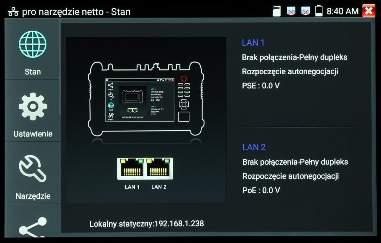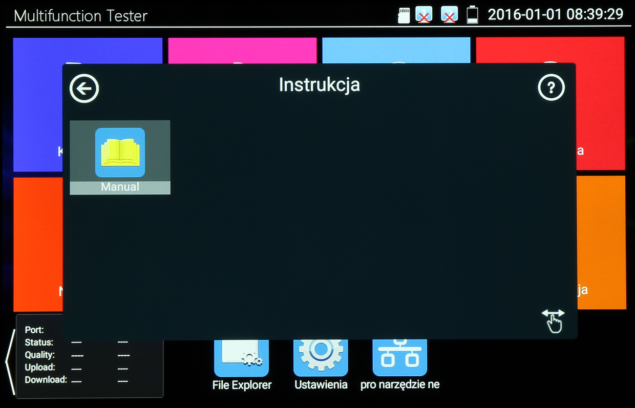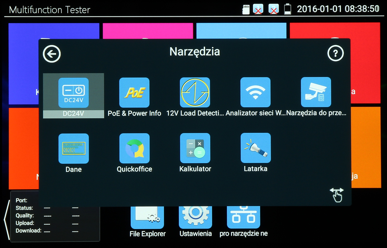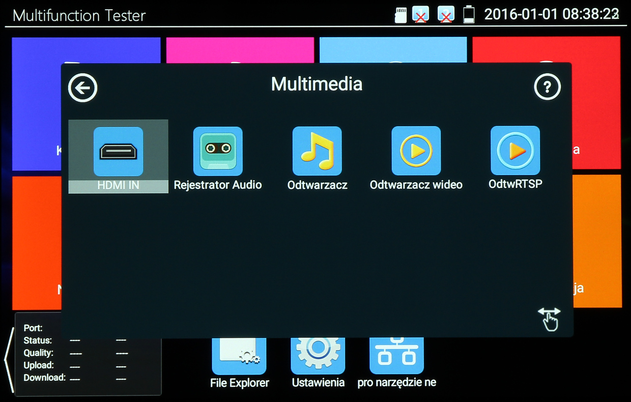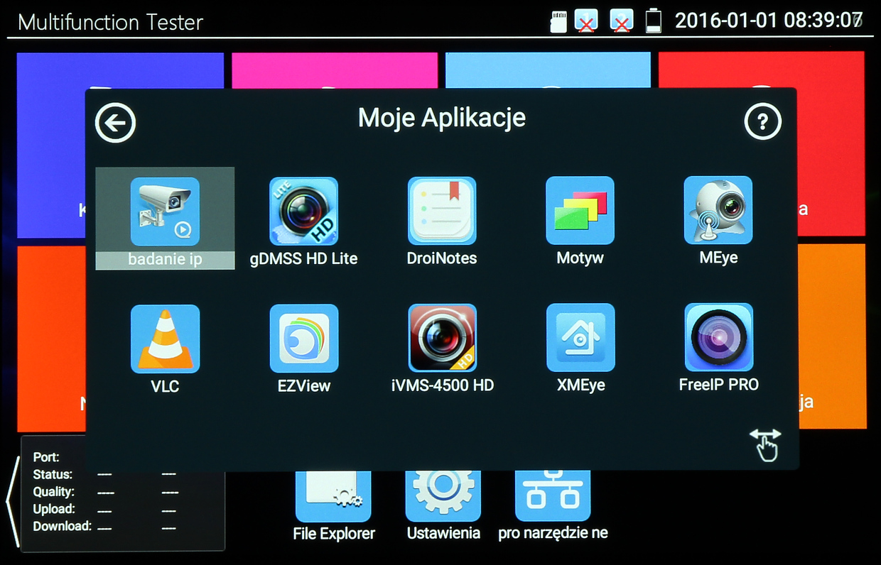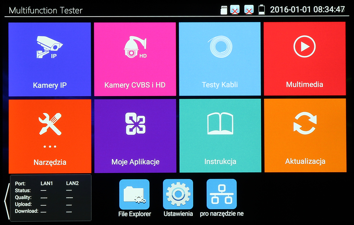 Video standard: AHD - 8 Mpx, HD-CVI - 8 Mpx, HD-TVI - 8 Mpx, TCP/IP - 4K, CVBS - PAL / NTSC ; Display: 7 " - capacitive touch screen, 1280 x 800 px ; Video input: 1 pcs AHD / HD-CVI / HD-TVI / CVBS - BNC socket 1 pcs HDMI ; Video output: 1 pcs CVBS 1 pcs HDMI ; LAN port: 2 pcs - PoE cameras and switches support ; Serial ports: RS-485 ; Protocols: : Pelco-D, Pelco-P ; Wi-Fi Module: 2.4 GHz ; Main features: Supported image compression methods : H.265, H.264, MJPEG ;