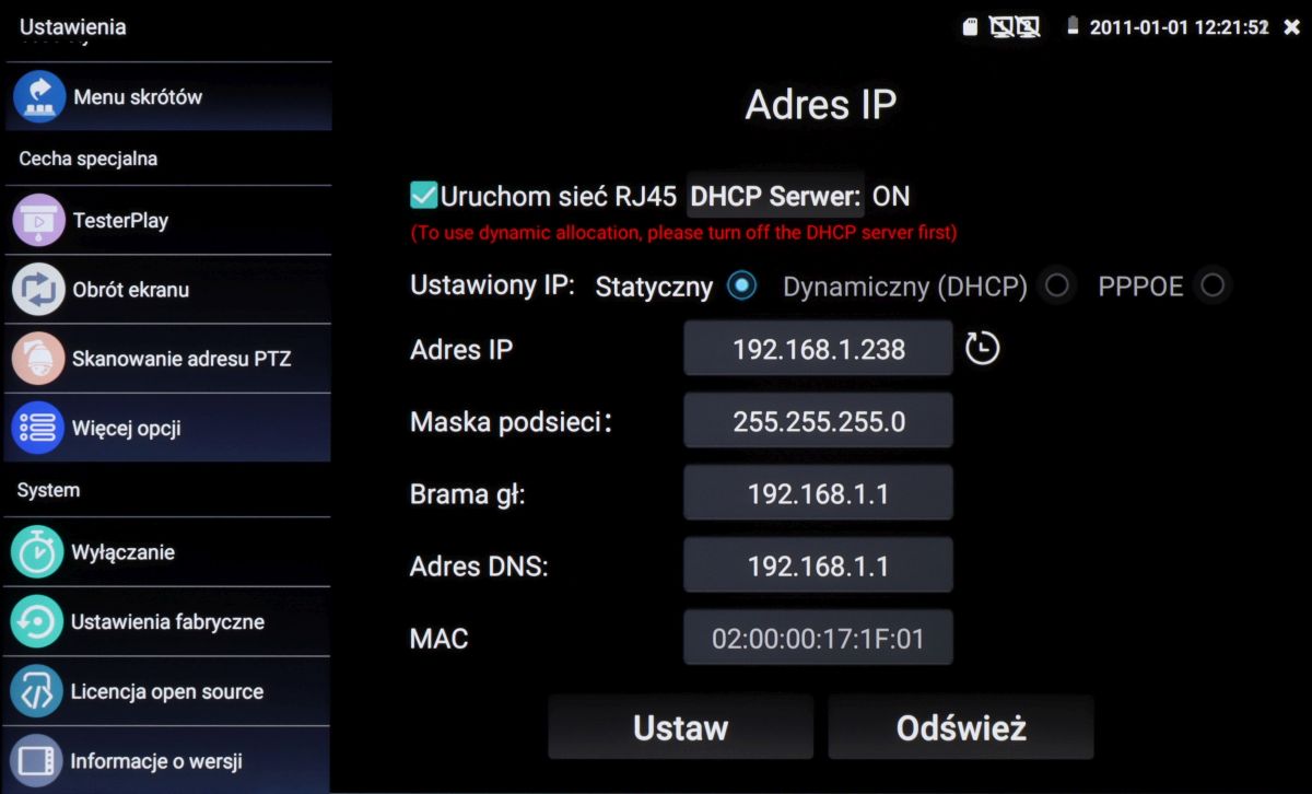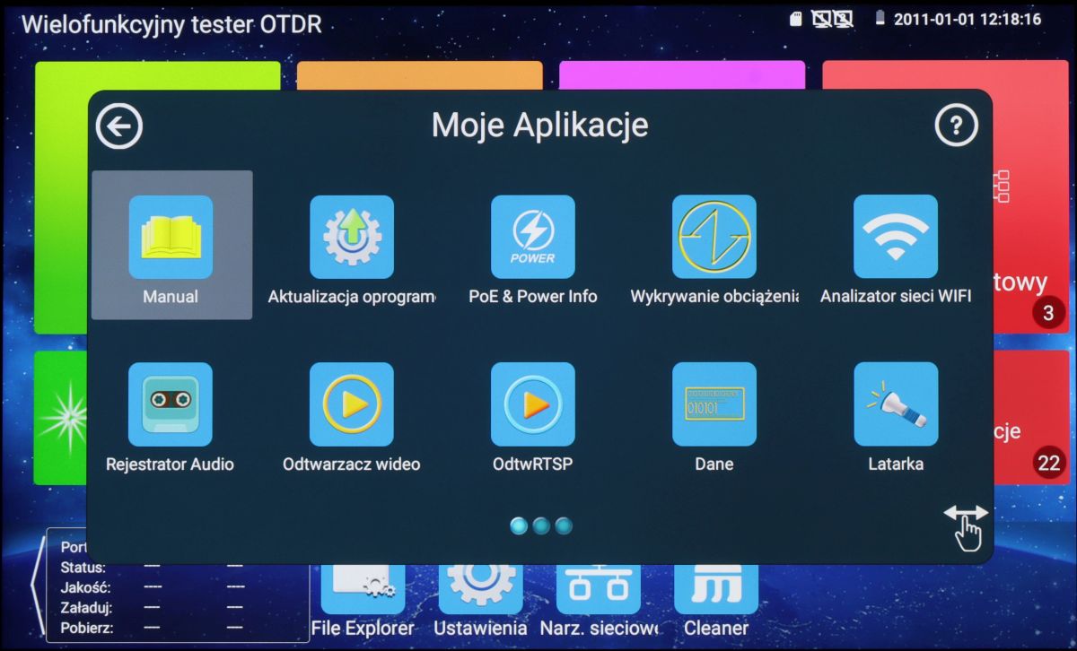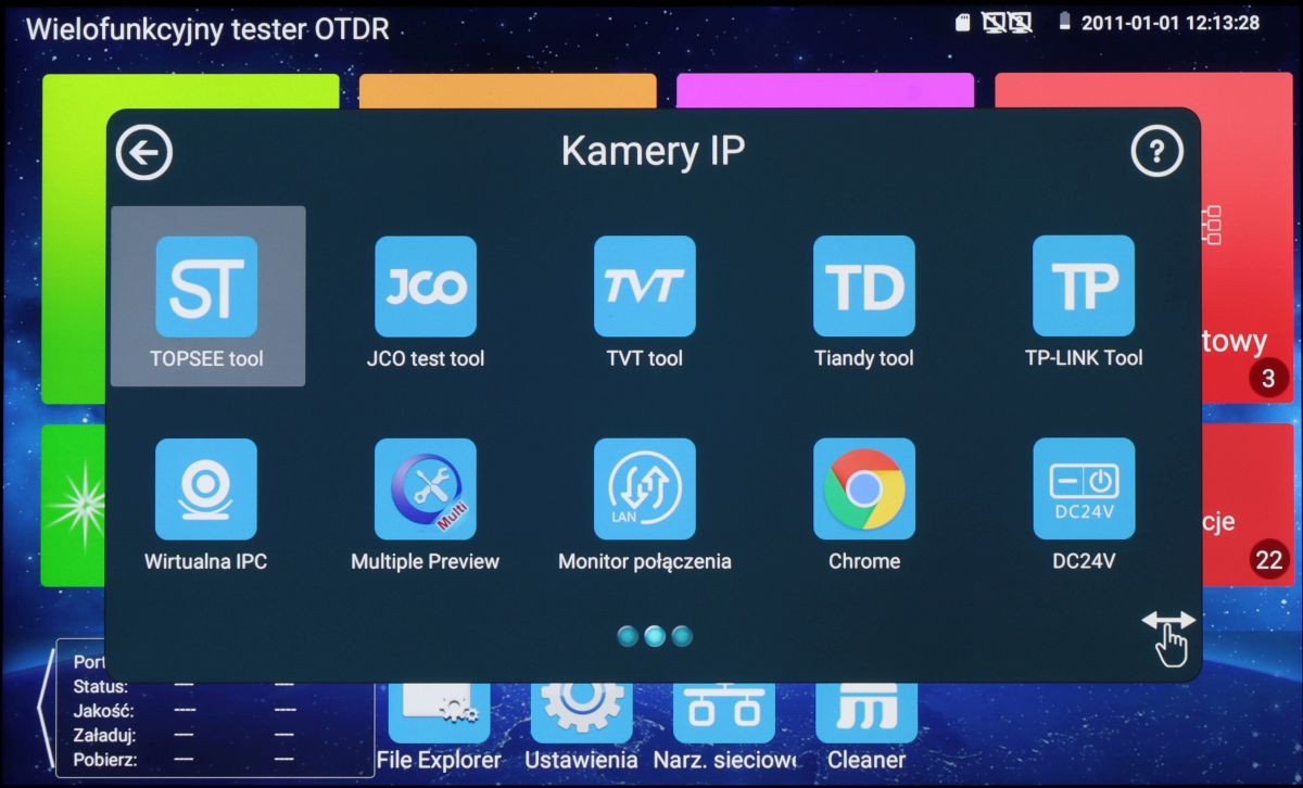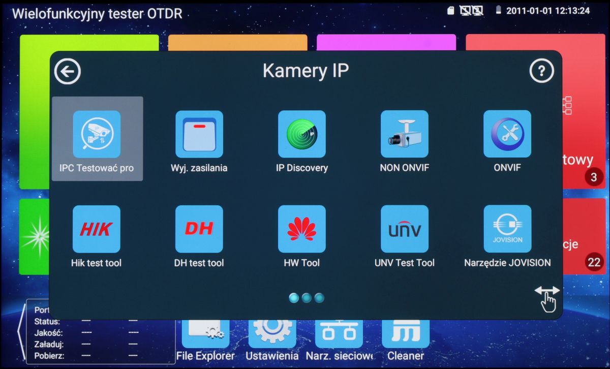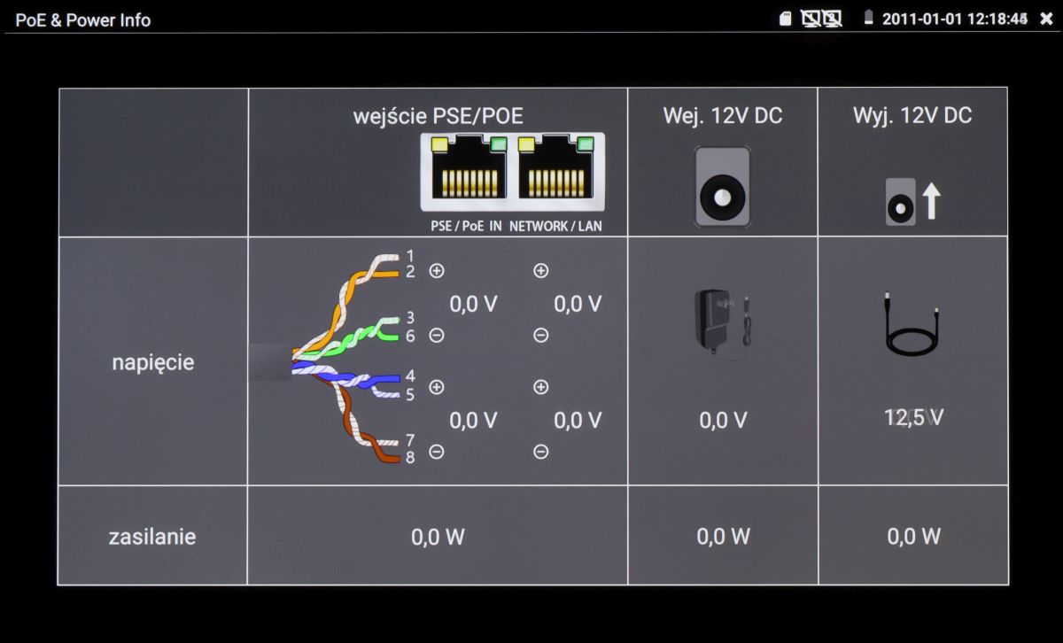 Optical time-domain reflectometer (OTDR): Optical wavelength : 1310 nm / 1550 nm, Wide measuring range ≤ 105 km ; Optical power measurement: Range : -70 ... +10 dBm ; VLS (VFL) - Visual Fault Locator of fiber cable: Laser LD ; Video standard: AHD, HD-CVI, HD-TVI - 8 Mpx, TCP/IP - 4K, CVBS - PAL / NTSC ; Display: 5.4 " Retina - capacitive touch screen, 1920 x 1152 px ; Video input: 1 pcs AHD / HD-CVI / HD-TVI / CVBS - BNC socket, 1 pcs HDMI 1 pcs VGA ; Video output; LAN port: 2 pcs - PoE cameras and switches support ; Serial ports: RS-485 ; Wi-Fi Module; Identification the wire in the group of wires; Main features: Supported image compression methods : H.265, H.264, MJPEG ;