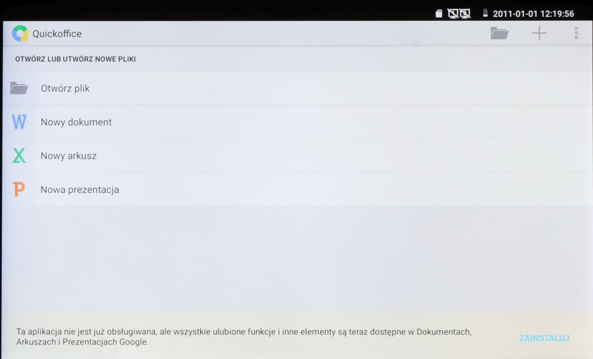 • Quickoffice package installed - creation and reading of .docx text documents, .xlsx spreadsheets and .pptx multimedia presentations