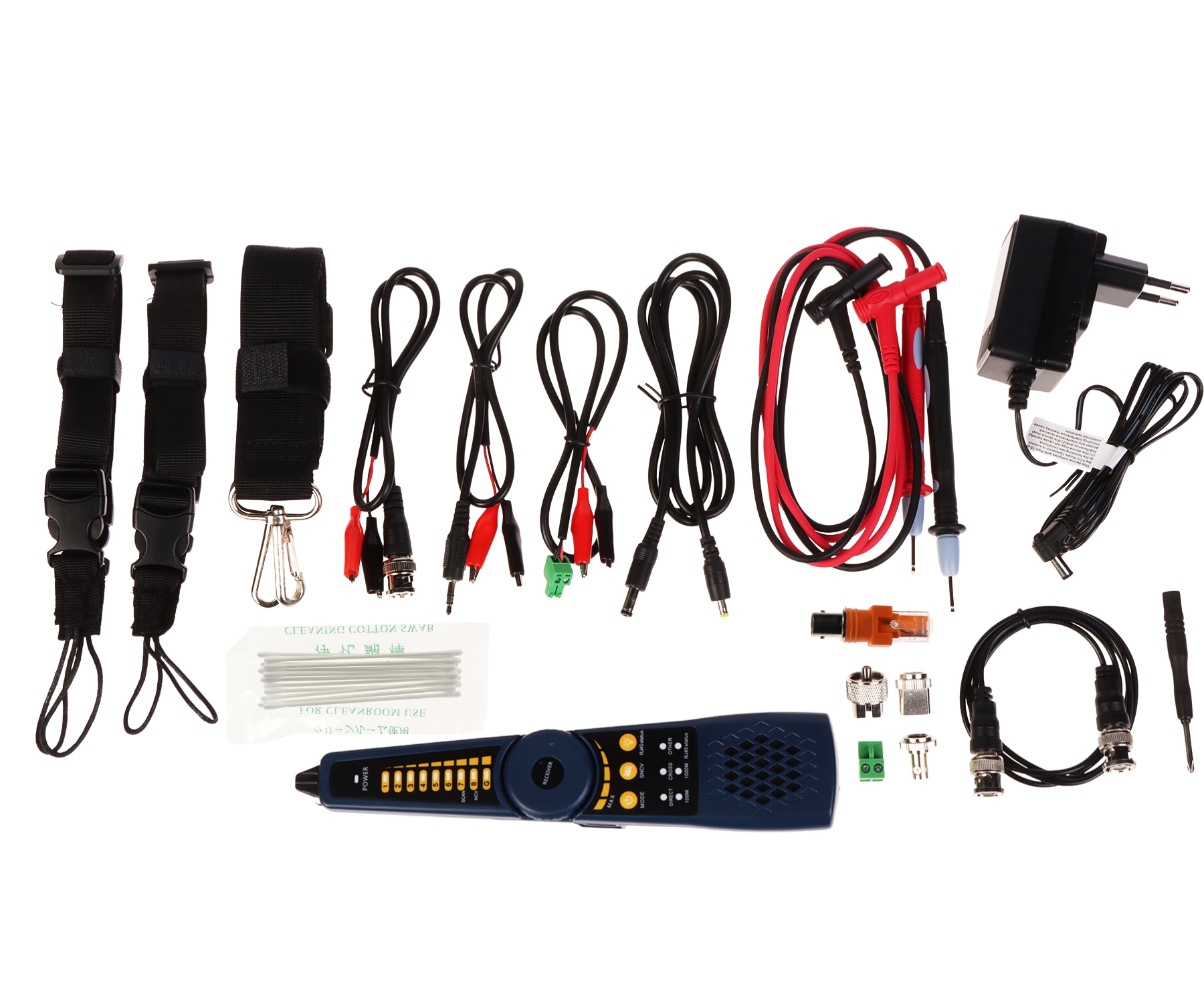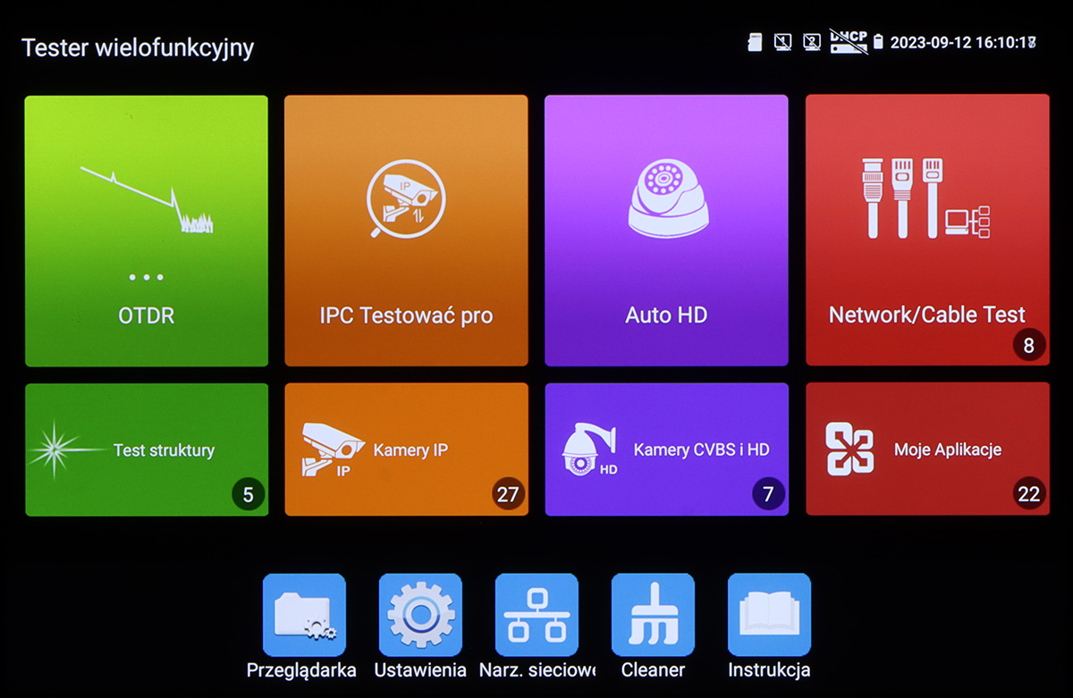 Optical time-domain reflectometer (OTDR): Optical wavelength : 1610 nm Wide measuring range ≤ 100 km ; Optical power measurement: Range : -70 ... +10 dBm ; VLS (VFL) - Visual Fault Locator of fiber cable: Laser LD ; Video standard: AHD, HD-CVI, HD-TVI - 8 Mpx, TCP/IP - 8 Mpx, CVBS - PAL / NTSC ; Display: 8 " IPS - capacitive touch screen, 1920 x 1200 px ; Video input: 1 pcs AHD / HD-CVI / HD-TVI / CVBS - BNC socket, 1 pcs HDMI 1 pcs VGA ; LAN port: 2 pcs - PoE cameras and switches support ; Serial ports: RS-485 ; Wi-Fi Module: 2.4 GHz ; Identification the wire in the group of wires; Digital multimeter: Measurement : voltage, current, resistance, continuity test, diode test, electrical capacity ; Main features: Supported image compression methods : H.265, H.264, MJPEG ;