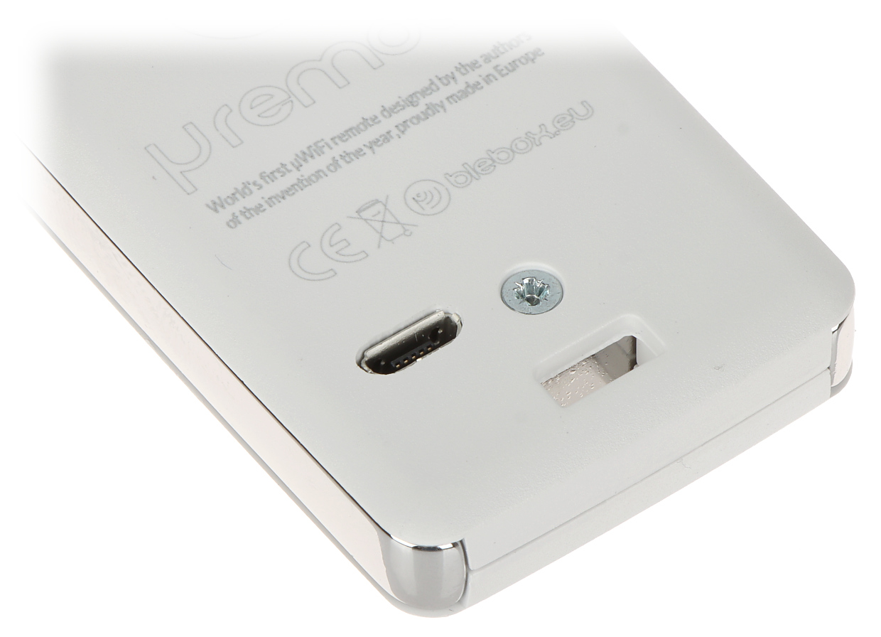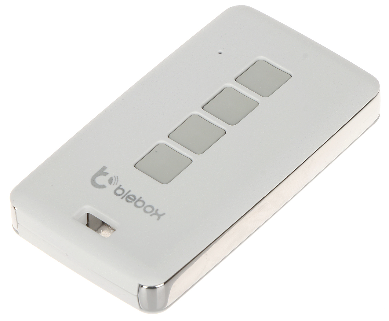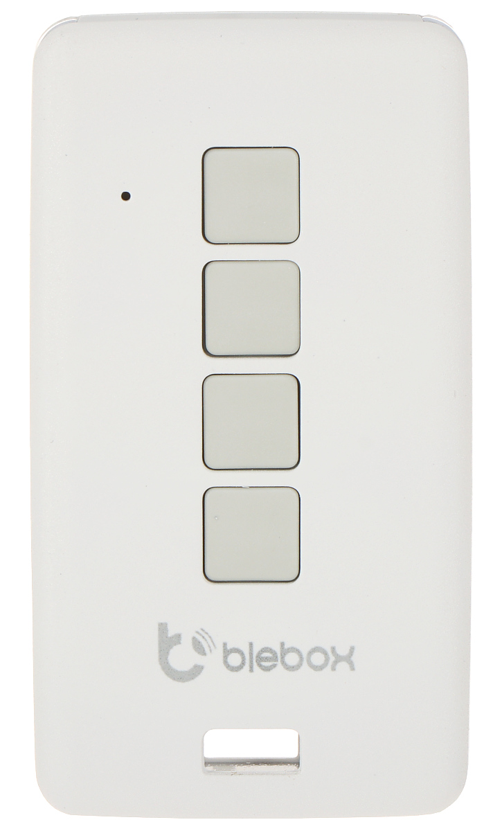 Four-channel universal remote control for BleBox system devices; Wireless: Wi-Fi, 2.4 GHz - IEEE 802.11g ; Operation range: ≤ 100 m (in open area) ≤ 40 m (internal) ; Main features: Number of buttons : 4 4 independent channels, 4 groups, Number of supported devices : 3 / Channel, Built-in vibration function (haptic feedback), μWiFi technology support ; Color: White ;