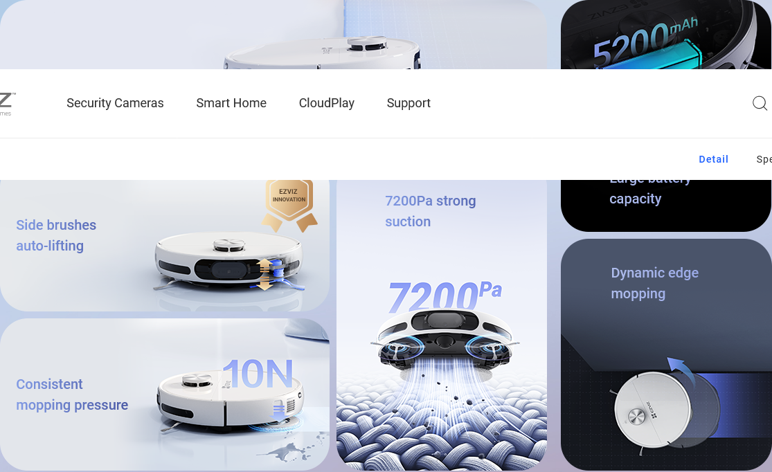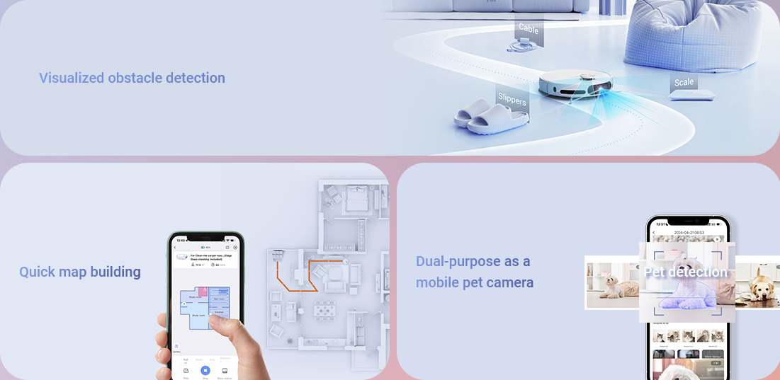 Smart DetectionObstacle Recognition, Room Recognition & Mapping, Carpet Recognition, AI-Powered Human Shape Detection, AI-Powered Pet Detection