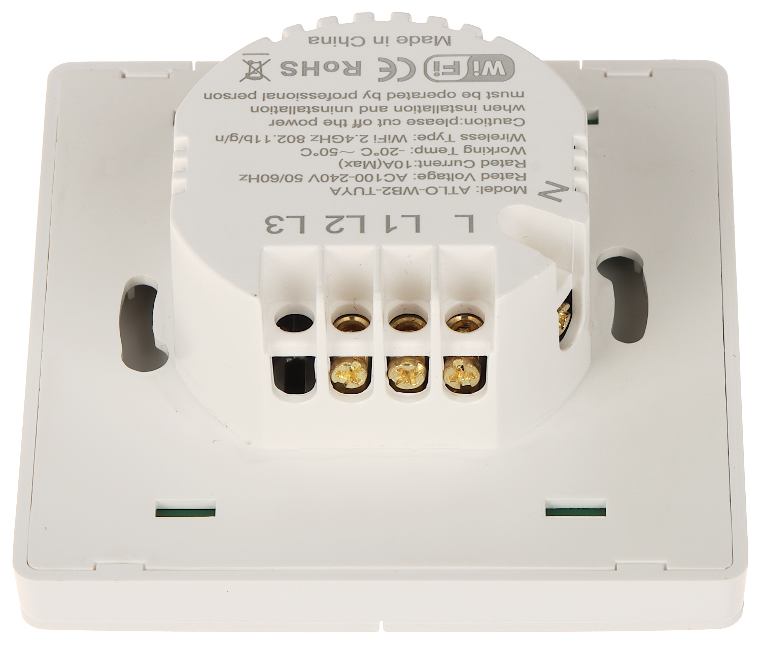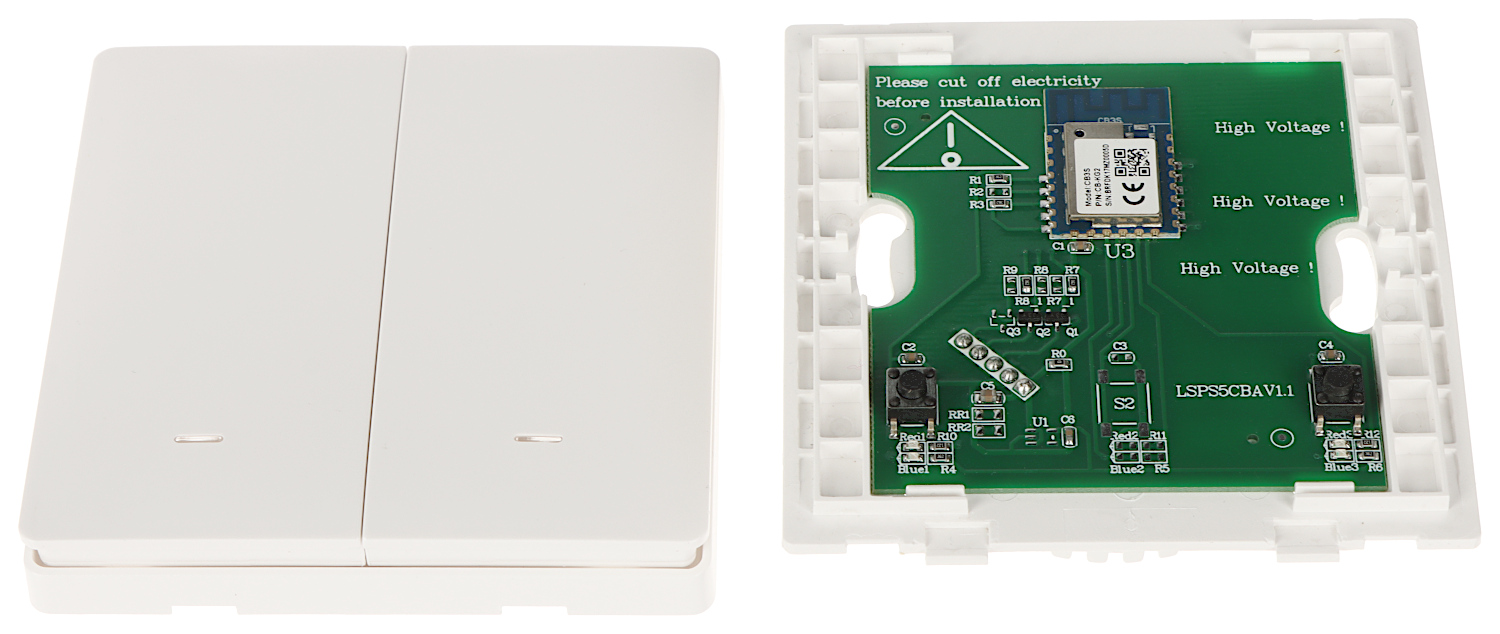 Application: Works with lighting - switching on/off ; Rated voltage: 100 ... 240 V AC ; Maximum power: 300 W (for each output) ; Number of buttons: 2 ; Number of outputs: 2 ; Connector type: screw terminals ; Wireless: Wi-Fi, 2.4 GHz - IEEE 802.11 b/g/n ; Main features: Local control by physical button, schedule, timer, Setting scenarios by different events, remote access, voice control ;