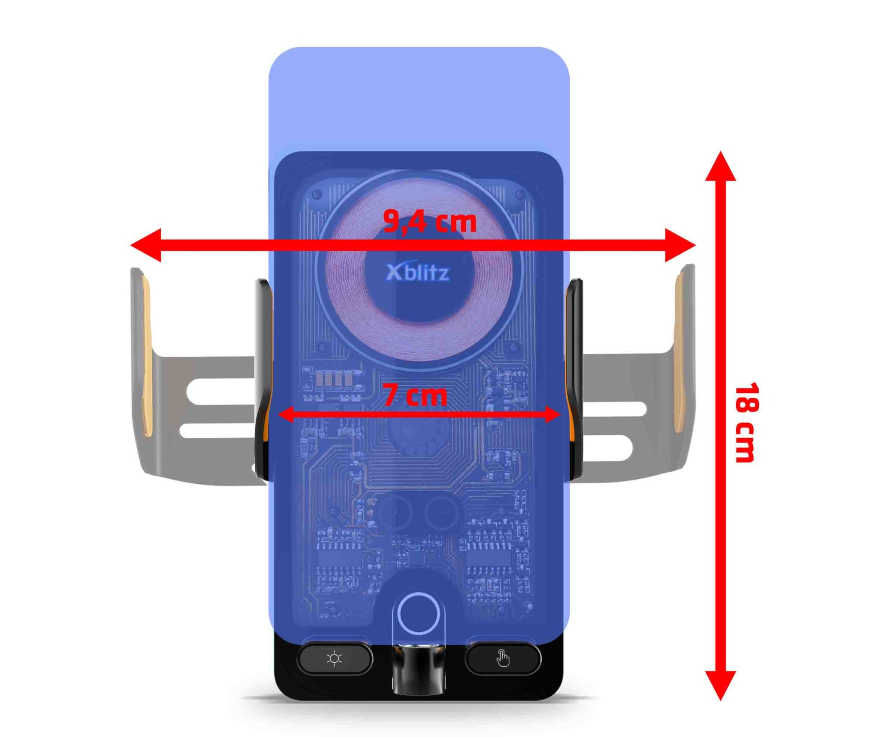 Method of mounting: Attachment to the ventilation grille ; Mobile device holder: Clamping ; Maximum arm size: 9.4 cm ; Main features: Automatic clamping of the device in the holder ; Charging method: wire ; Manufacturer / Brand: Xblitz ;