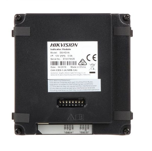 Модуль DS-KD-IN предназначен для работы с модулем видеодомофона DS-KD8003-IME1 или DS-KD8003-IME2. Устройство используется для визуальной сигнализации о статусе голосового соединения видеодомофона с внутренней панелью, а также открытия калитки.