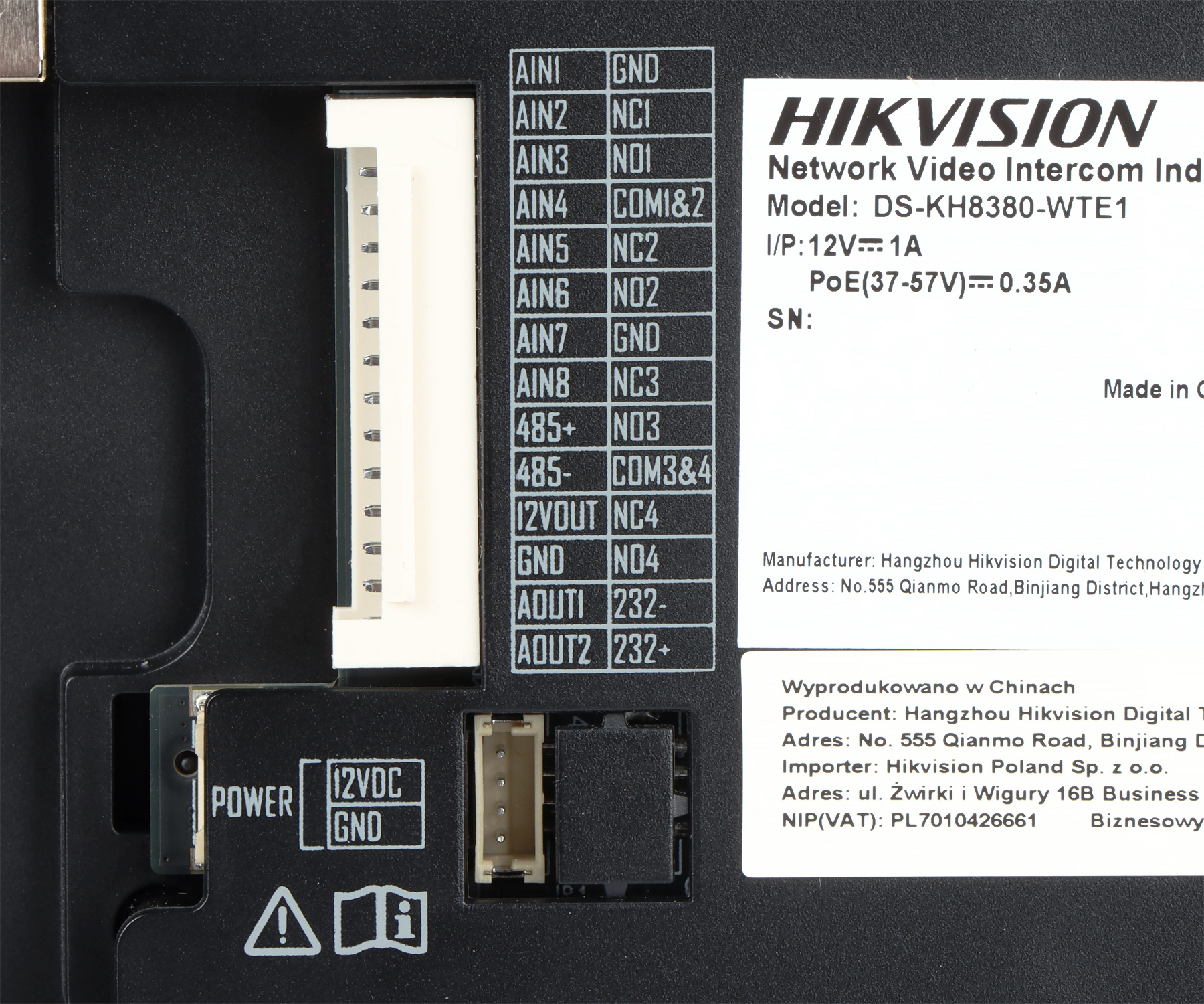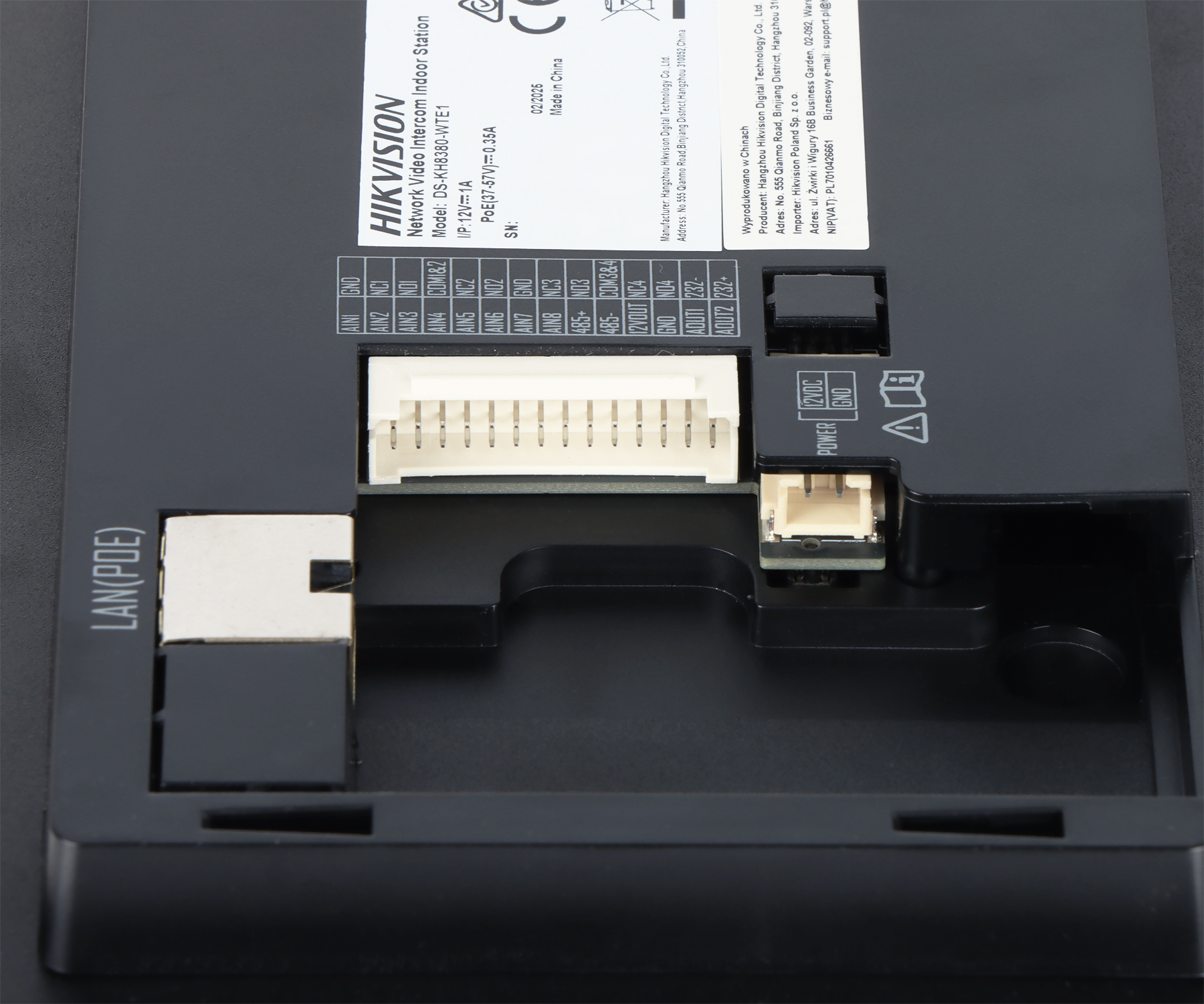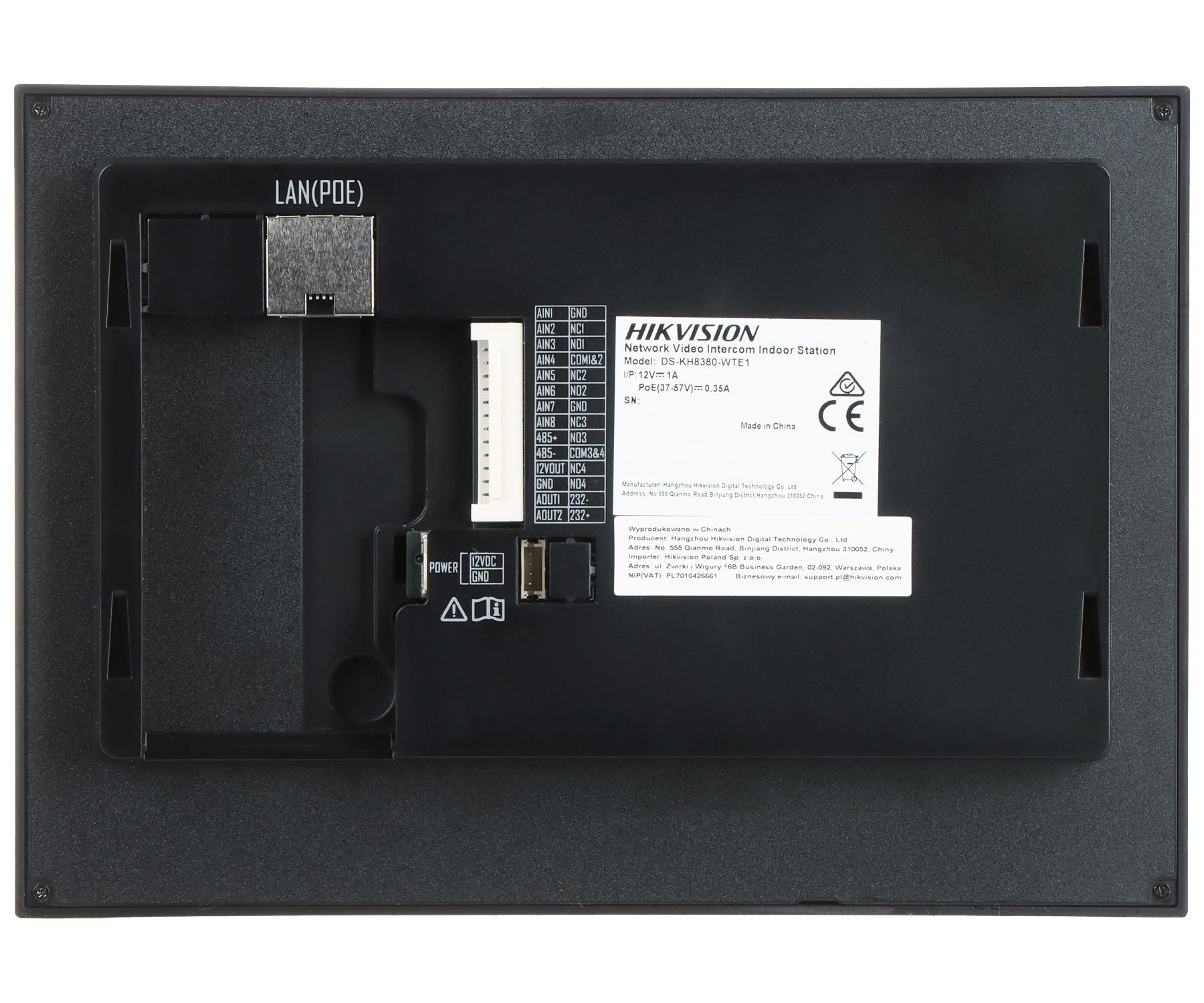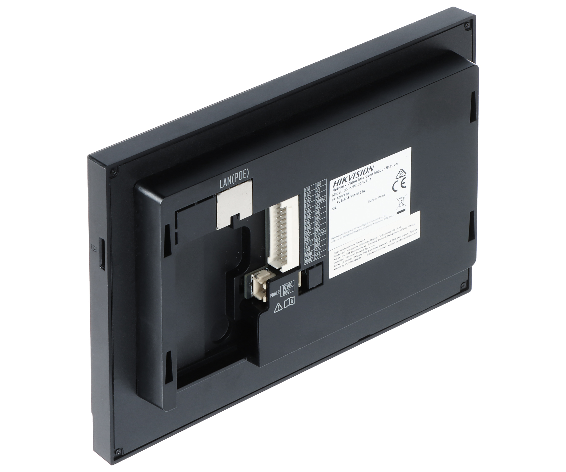 Compatibility: Hikvision IP Video Doorphones ; Shield: 7 " - capacitive touch screen ; Resolution: 1024 x 600 ; Internal memory: 128 MB (built-in) ; Main features: Wi-Fi Module - IEEE 802.11 b/g/n, Relay outputs : 4 x NO/NC, Remote opening via a mobile client or software, Bidirectional communication, Automatically capture and save photos if there is no response to the bell button, ; Alarm inputs: 8 ; Power supply: PoE (802.3af), 12 V DC ;