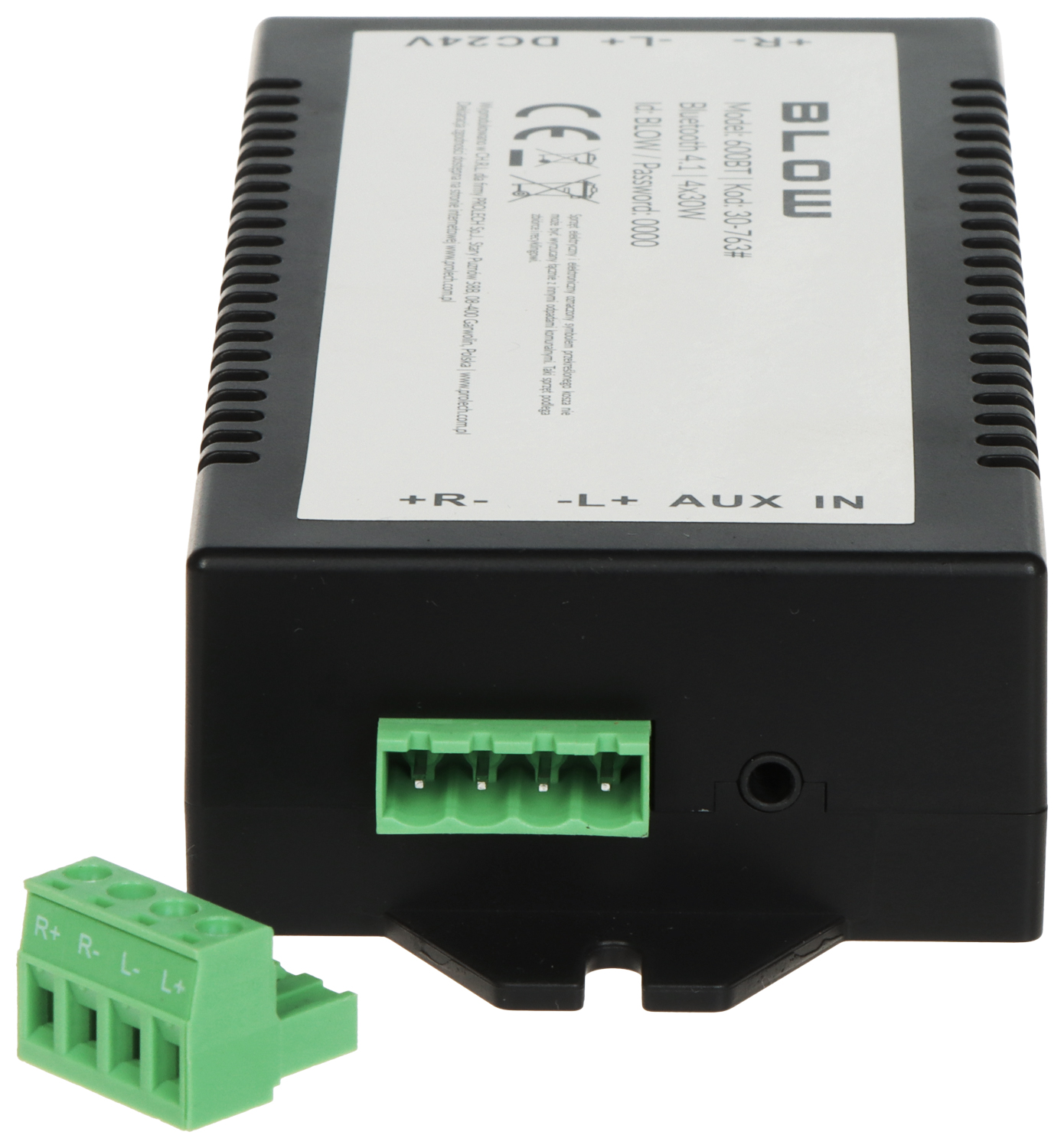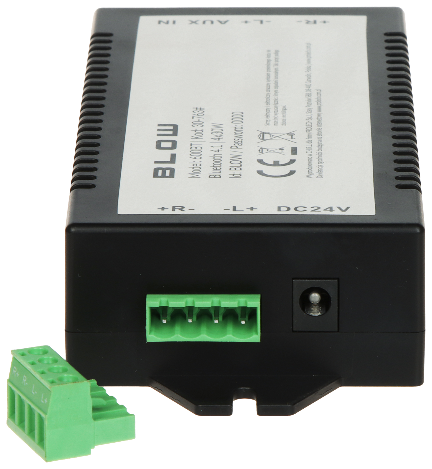 Nominal power: 120 W ( 4 x 30 W ) ; Audio inputs: AUX - Jack 3.5 mm ; Audio outputs: 4 / 8 Ω, 4-way - terminals ; Interface: Bluetooth 4.1 ; Power supply: 24 V DC ;