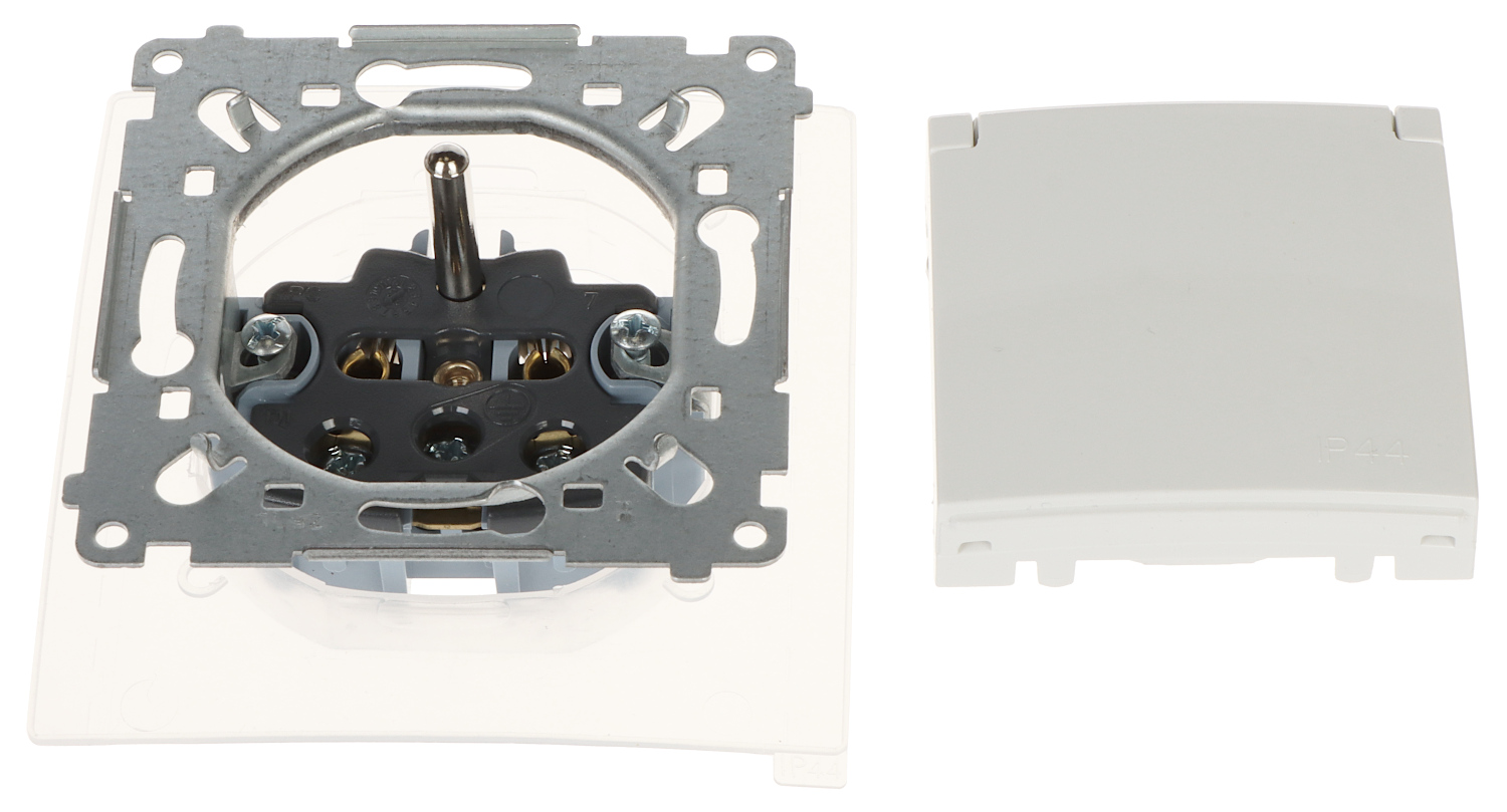 Rated voltage: 250 V AC ; Maximal current load: 16 A ; Grounding; Cable terminals: screw terminals ; Socket type: CEE 7/5 ; "Index of Protection": IP44 ; Color: White (RAL 9003) (cover), White (RAL 9003) (flap) ;